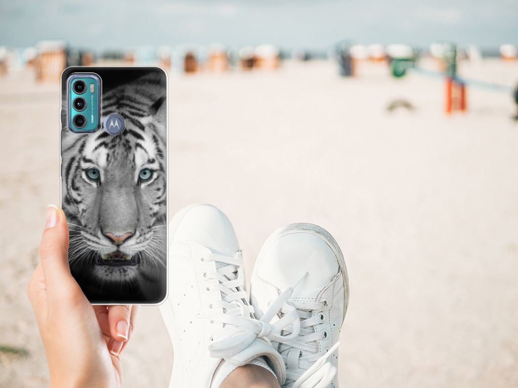 Omdat de Witte Tijger zo bijzonder is, zijn wij bereid deze voor zeer lage kosten op een tpu case te zetten. Dit kunnen we zo goedkoop doen omdat we het drukwerk in eigen beheer doen. Witte tijgers leefden lange tijd in de bossen van India, Bangladesh, Nepal, Bhutan en China en kunnen wel 257 kilo wegen. Dit zwaargewicht kunnen we bedrukken op verschillende soorten hoesjes, zoals deze tpu cases. Deze Motorola Moto G60 TPU Hoesje kan exclusief in het bezit van jou komen. Zeker als je er zelf nog unieke teksten en/of beelden aan toevoegt. Het tpu hoesje is zeer flexibel en wordt alleen aan de bovenzijde bedrukt. De randen van dit flexibele hoesje blijven doorzichtig. Tegenwoordig zijn witte tijgers alleen in gevangenschap te bewonderen. Jij zorgt voor een goede bescherming van je smartphone met dit design hoesje met witte tijger.