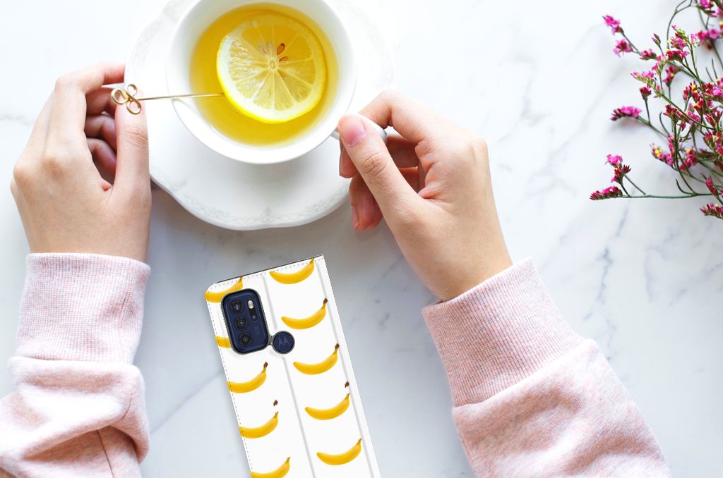 Bananen zitten tjokvol natuurlijke energie-oppeppers. Fructose, glucose, vezels… om er maar eens een paar te noemen. Een banaan is zo’n energiebom, dat wanneer je er twee eet je genoeg energie verzameld hebt om anderhalf uur vol te sporten. Deze vrucht geeft power, daarom misstaan ze ook niet op deze leuke Motorola Moto G60s Flip Style Cover. Jouw smartphone blijft zijn kracht behouden als je kiest voor dit design hoesje met bananen. Het grijswit geblokte patroon op de achtergrond geeft nog wat extra’s aan de banaan. Altijd als een print van een banaan op je hoesje willen hebben? Dit is je kans. De bananen staan op een stand case. Deze case beschermt jouw telefoon aan alle kanten en beschikt over een 1 opbergvakje en een speciale standaard. Met het aantal bananen dat op dit hoesje staat heb je energie voor een hele maanden of misschien wel een paar maanden. Het hoesje wordt afgesloten met een magneet aan de binnenzijde. De houder aan de binnenzijde is van TPU.