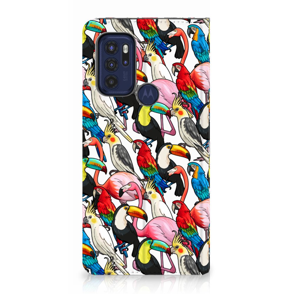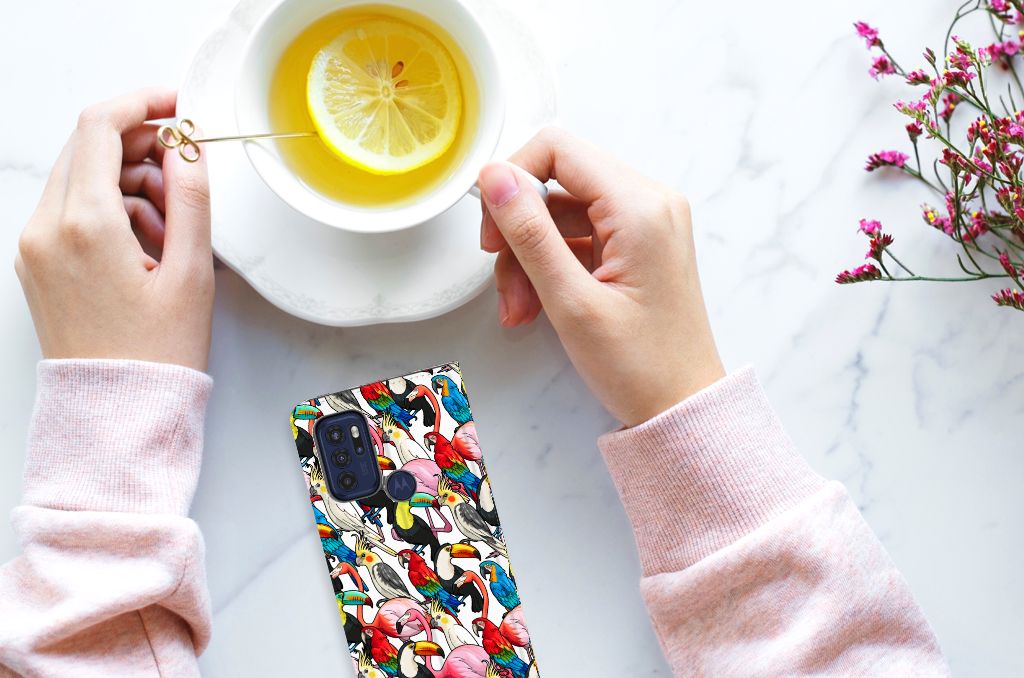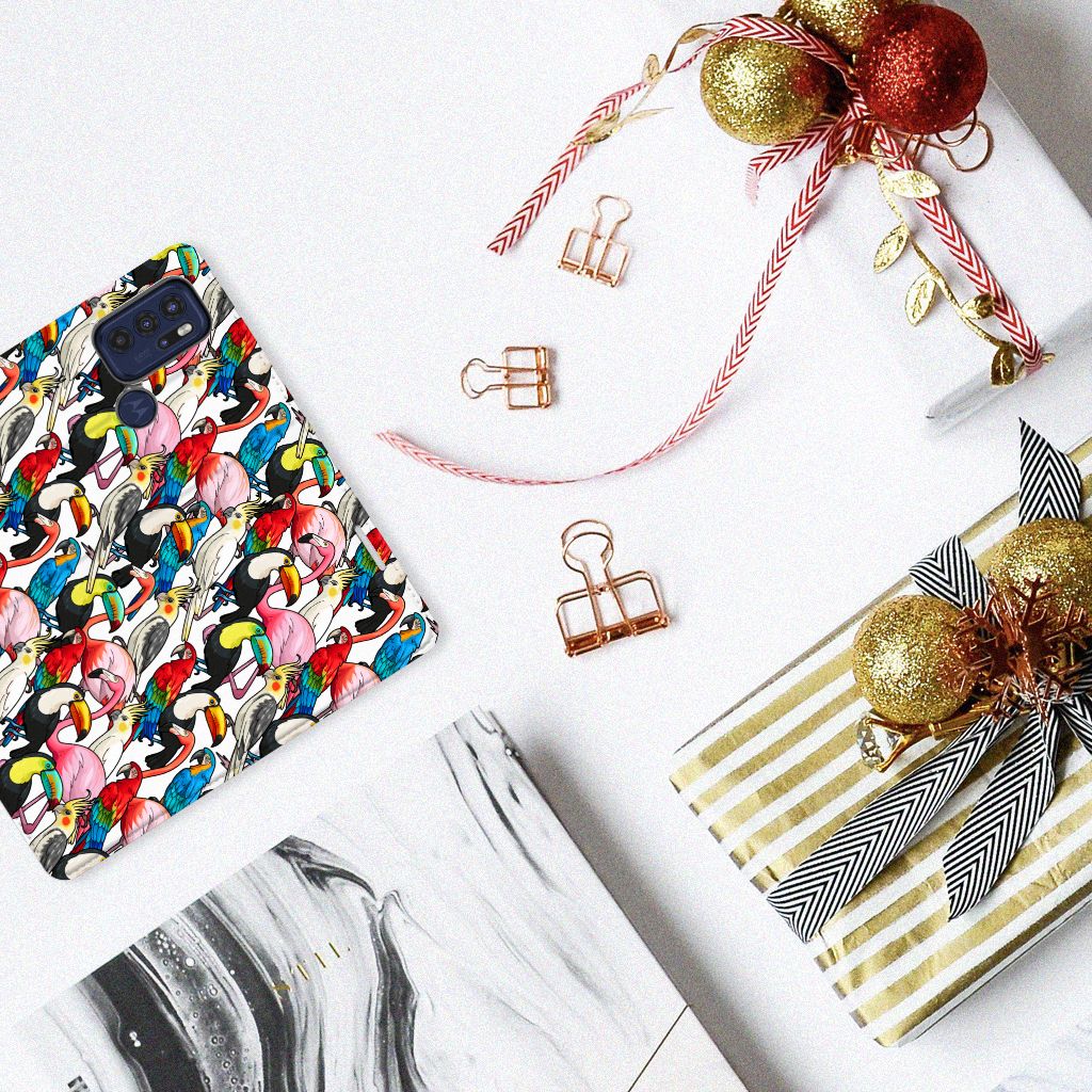 Dit exotische hoesje vol prachtige vogels is een genot voor het oog. Dankzij de felgekleurde toekans, papegaaien, flamingo’s en kaketoes op dit design word je meteen vrolijk als je naar dit hoesje kijkt. Je waant je meteen in de tropen met dit bonte gezelschap tegen een witte achtergrond. Het ontwerp staat op een Hoesje maken voor de Motorola Moto G60s. Dit populaire smartphonehoesje met het beton-design heeft één vakje voor een pasje of briefgeld en is aan alle zijden bedrukt. Met de standcase zet je je telefoon gemakkelijk neer, zodat je je handen vrij hebt als je bijvoorbeeld een video wilt kijken. De binnenkant van de standcase is van grijs PU-leer. Dat is fijn, omdat je daardoor niet snel vlekken ziet op je hoesje.