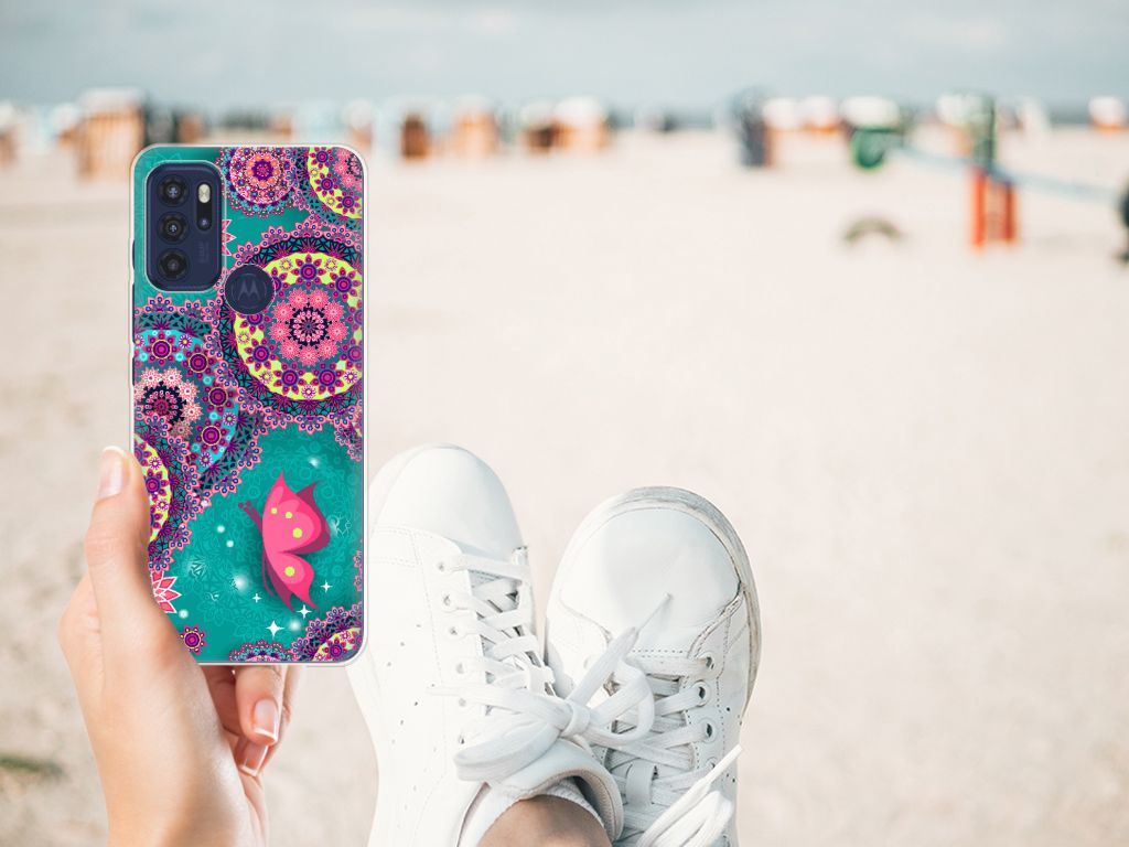 Deze opvallende Motorola Moto G60s Hoesje maken met Cirkels en Vlinders is een ware eyecatcher. De meeste vlinders hebben een onopvallende vleugelkleur en dat kun je van de soort op dit hoesje ook zeker wel zeggen. Wij kunnen deze opvallende vlinders en cirkels op een zeer handige tpu case zetten. Deze hoesjes zijn gewild omwille hun flexibiliteit. Met onze geavanceerde printer zetten we de print van opvallende vlinders en cirkels op de achterkant van het hoesje. De case met vlinders en cirkels blijft aan de zijkanten doorzichtig, zodat je maximaal het design van je smartphone behoudt. Verder is je telefoon natuurlijk goed beschermd met deze tpu case met print van blauwe vlinders. De bovenkant wordt bedrukt, de zijkanten niet. Met een screenprotector bescherm je ook het scherm maximaal.