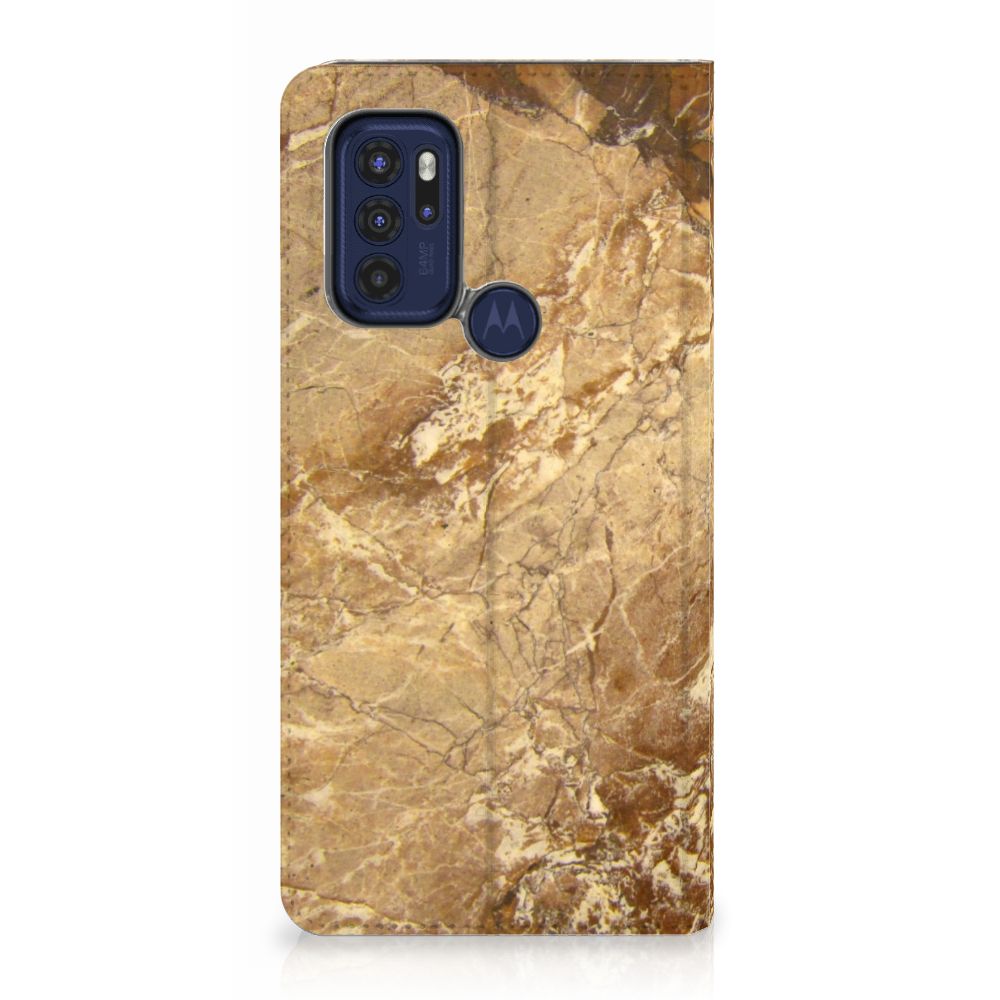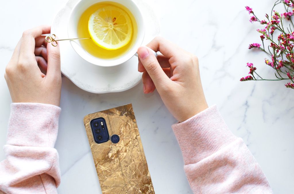 Dit design hoesje met Marmer in lichtbruine kleur is voor de artistiekelingen onder ons. De Grieken en Romeinen wisten het marmer al te waarderen door het in de bouw toe te passen. Naast het witte marmer zijn de diverse soorten marmer in een gevarieerde kleurensamenstelling te krijgen. We hebben verschillende mooie kleuren op design hoesjes gezet, zoals in dit geval het lichtbruine marmer. Dit is een Motorola Moto G60s Standcase met marmer in lichtbruine kleur. Het marmer wordt bedrukt op alle zijden van een stand case, die beschikt over 1 vakje voor een pasje en een magnetische sluiting aan de binnenzijde. Verder heeft de hoes een houder van TPU. Door de rijkdom aan kleuren en varianties in afwerking kunnen ontwerpers met marmer schitterende architectonische projecten realiseren. Wij hebben hetzelfde gedaan en onze ontwerper veel vrijheid geboden. Het resultaat zie je terug in deze stand case met lichtbruin marmer, dat de ideale bescherming voor jouw smartphone is.