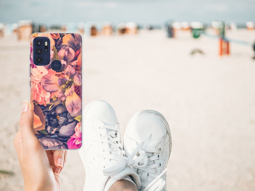 Dit Bosje Bloemen doet een mens en zijn smartphone goed. De oranje, paarse en roze bloemen op deze Motorola Moto G60s TPU Case geven jouw smartphone een zeer sierlijke uitstraling. Je wordt er ook meteen vrolijker van als je aan het appen, mailen of aan het bellen bent. Valt dan je telefoon op de grond, dan zal er dankzij de tpu case met oranje, paarse en roze bloemen geen schade ontstaan. Helemaal niet als je er een screenprotector bij hebt gekocht. Onze tpu cases met oranje, paarse en roze bloemen zien er zeer prettig uit en zijn heel praktisch, getuige onder meer de opstaande randen en het flexibele materiaal. Alleen de achterkant van de tpu case wordt bedrukt met oranje, paarse en roze bloemen. Op deze tpu case is het ook mogelijk je eigen ontwerp te zetten. In no time ontwerp je zelf een tpu case met daarop foto’s van jouw favoriete bloemen.