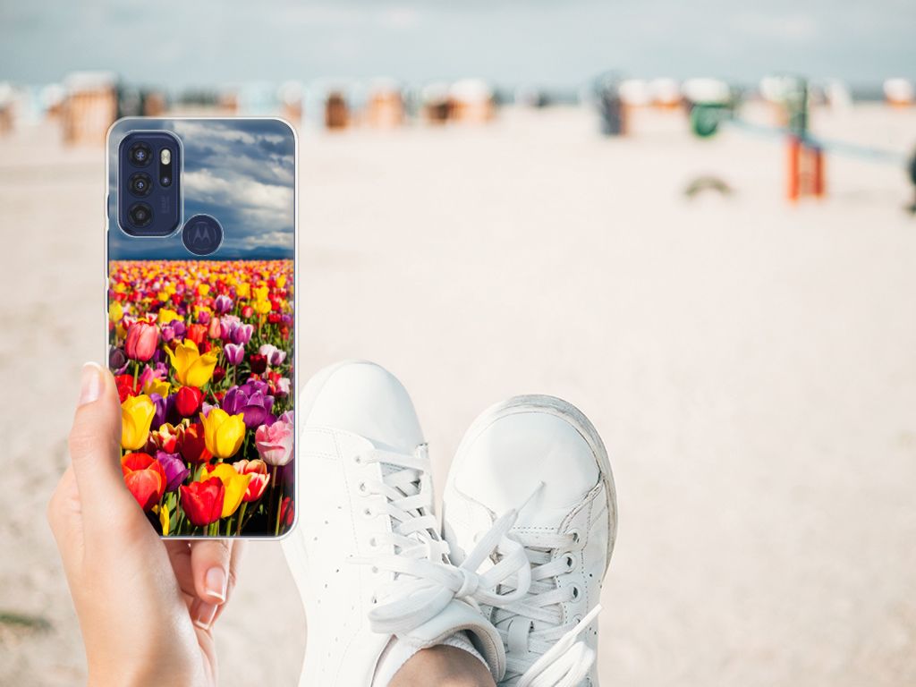 De tulp is een oer-Nederlandse bloem en heeft een lange geschiedenis. Deze Motorola Moto G60s TPU Case met Tulpen ziet er bijzonder kleurrijk uit. Dit fleurige smartphone hoesje geeft een bijzondere bescherming van jouw apparaat. Tulpen zijn ideaal voor een kleurrijk begin van het tuinseizoen. Iedereen wordt er vrolijk van om te zien hoe deze bloemen het voorjaar kleur geven en het begin van de warmere tijd van het jaar aankondigen. Dan kan het toch niet anders of jij wordt heel erg blij van deze tpu case met tulpen? Deze tpu case is zeer flexibel en past altijd in je broekzak. Het materiaal is zeer elastisch en onbreekbaar. De case wordt niet aan alle zijden bedrukt met tulpen. De randen blijven transparant. Je kunt ook zelf een tpu case maken met daarop jouw favoriete bloem.