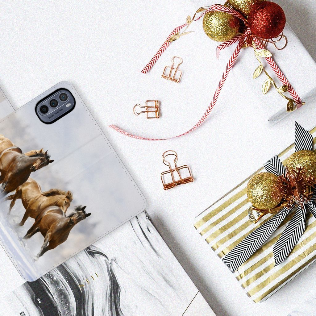 Als je een paardenliefhebber bent, dan is dit telefoonhoesje met ruimte voor pasjes misschien wel wat voor jou. Ondanks dat er paarden op staan, heeft deze bookcase toch een rustig uiterlijk. Dit is ook dankzij de kleuren die gebruikt zijn. Als je liever jouw eigen paarden terugziet op dit Motorola Moto G62 5G hoesje, dan is dit ook mogelijk! Voor een uniek Telefoonhoesje met Pasjes kun je jouw foto insturen zodat deze op het hoesje kan worden gedrukt. Zo heb jij jouw paarden toch altijd een beetje bij je. Naast dat dit unieke telefoonhoesje erg mooi is, is hij ook nog functioneel. Het is een telefoonhoesje met ruimte voor pasjes, zodat al jouw belangrijke zaken op één plek kunnen worden bewaard. Hierdoor zal je jouw pasjes een stuk minder snel kwijtraken en heb je ze altijd bij de hand.