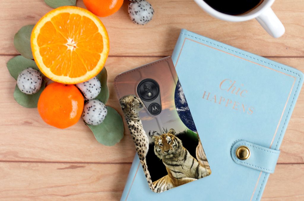 Deze standcase met roofdieren kan exclusief in het bezit van jou komen. Bovendien kun je hier zelf nog unieke teksten en/of beelden aan toevoegen. Je Hoesje maken krijgt dan een unieke identiteit. Roofdieren zoals tijgers op dit hoesje zijn voortdurend op zoek naar een geschikte prooi. De tijgers met aardbol op de achtergrond op deze stand case geven jouw Motorola Moto G7 Play een hele stoere uitstraling. Deze bijzondere case is van PU-leer (buitenzijde) en TPU (binnenzijde) en beschikt over een houder en een speciale standaard. Verder is deze stand case met roofdieren voorzien van een magnetische sluiting aan de binnenzijde. Je zorgt voor de perfecte bescherming van je smartphone met dit design hoesje met roofdieren met aardbol op de achtergrond.