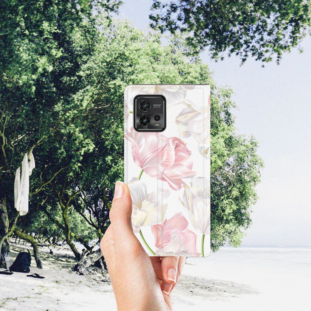 Een bosje bloemen doet een mens (en zijn smartphone) goed. De witte en roze bloemen op dit Motorola Moto G72 Smart Cover geven jouw smartphone een zeer mooie uitstraling. Je wordt er ook meteen een stuk rustiger van als je aan het appen of aan het bellen bent. Valt dan je telefoon op de grond, dan zal er dankzij de stand case met het design Lovely Flowers ontstaan. Onze stand cases met roze en witte bloemen zien er zeer prettig uit en zijn heel praktisch, wat blijkt uit onder meer het vakje aan de binnenkant en de handige standaard waarmee je de smartphone rechtop op tafel neer kunt zetten. De roze en witte bloemen passen goed op alle zijden van de case. Op deze stand case van leer en TPU (houder aan de binnenkant) kun je trouwens ook je eigen bloemige ontwerp zetten. In een paar simpele stappen maak je zelf een stand hoesje met daarop jouw mooiste bloemen.