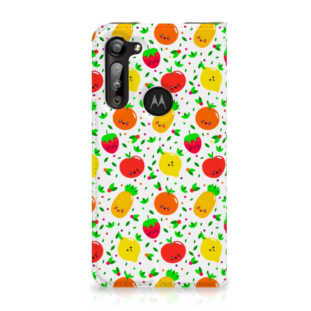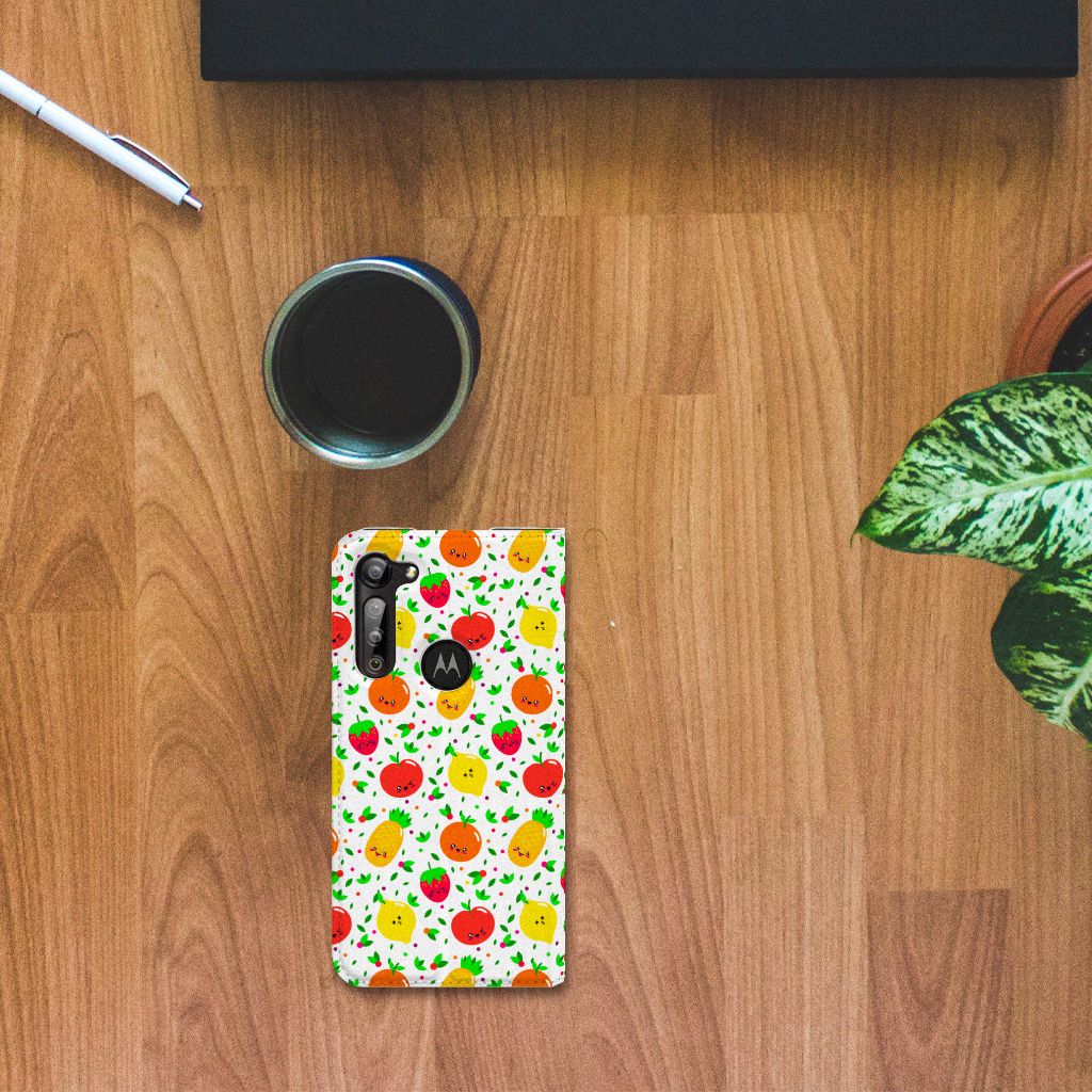 Een fris, fruitig en vrolijk hoesje, deze case met afbeeldingen van aardbeien, ananassen, appels, sinaasappels en citroenen. Minstens twee stuks fruit per dag wordt aanbevolen als dagelijkse hoeveelheid voor de mens. Dit verkleint de kans op allerlei ziekten. Dus met het aantal stukken fruit op de Motorola Moto G8 Power Flip Style Cover zou je wel een maandje zoet moeten zijn. Met het hoesje zelf kun je je hele leven doen, dit is namelijk niet stuk te krijgen. Dit komt door het sterke en flexibele materiaal waarvan het gemaakt is. De vrolijk stemmende case het desing Fruits maakt jouw telefoon dus zeer duurzaam. Zorg ervoor dat jouw smartphone gezond blijft en kies voor dit hoesje met frivool fruit. Een stand case met fruit beschermt jouw telefoon aan alle kanten en beschikt over een 1 opbergvakje en een speciale standaard. Het hoesje met fruit wordt afgesloten met een magneet aan de binnenzijde. De houder aan de binnenzijde is van TPU.