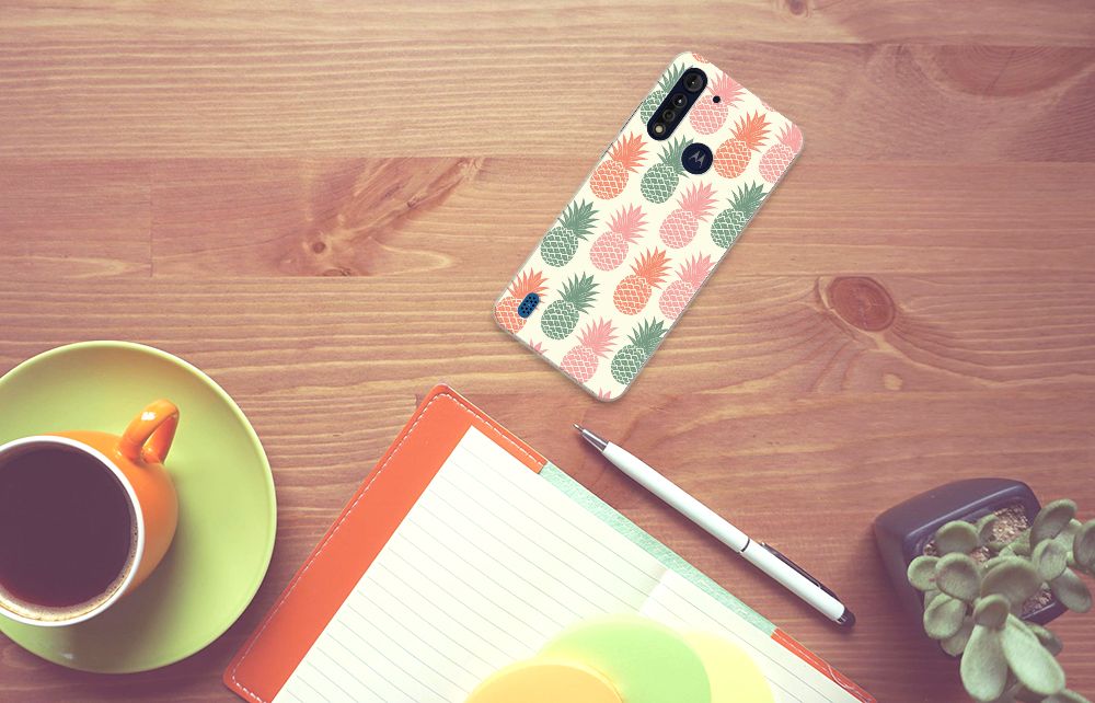 Ananas is een woord uit het Tupi, de taal van de Tupi-indianen, en betekent uitmuntende vrucht. Dit fruit van zeer hoge kwaliteit staat op onze superieure boekhoesjes, stand cases, hard cases en TPU cases. Jij blijft er gezond uitzien als je zo nu en dan een hap neemt van een Ananas , jouw smartphone blijft tip top in orde als je er een leuk telefoonhoesje omheen doet. Een ananas heeft stevig, veerkrachtig vruchtvlees. Een beetje te vergelijken met het TPU in onze hoesjes. TPU is elastisch materiaal, dat zeer buigzaam is. Vandaar dat het zeer schokbestendig is. Het ananas design staat op een staat op een TPU case. Deze Motorola Moto G8 Power Lite Siliconen Case wordt alleen aan de bovenkant bedrukt en is zeer flexibel. De randen van het hoesje blijven transparant.