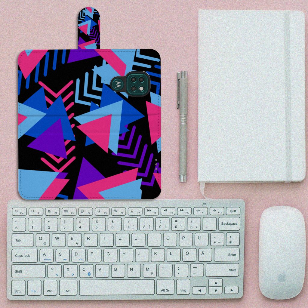 Dit fraaie hoesje met het design Funky Triangle is alles behalve eenvoudig en sober. Dat komt goed uit, want je hebt natuurlijk ook geen doorsnee telefoon gekocht. Mocht je dat wel hebben gedaan, dan wordt hij meteen speciaal als je een Motorola Moto G9 Play | E7 Plus Book Case koopt voor een spotprijsje. Een ding is zeker: opvallen ga je beslist met dit hoesje met paarse, roze en blauwe driehoeken. Jij zult in je element zijn met dit design hoesje met paarse, roze en blauwe driehoeken, omdat het er schitterend uitziet en jouw telefoon perfect beschermt. Het smartphonehoesje beschermt jouw telefoon aan alle zijden en beschikt over verschillende houders voor pasjes en briefgeld. De case sluit perfect af met een lipje aan de buitenkant. De houder aan de binnenzijde is van TPU. Alle zijden van het hoesje worden bedrukt, inclusief het lipje. De paarse, roze en blauwe driehoeken maken de case helemaal af.