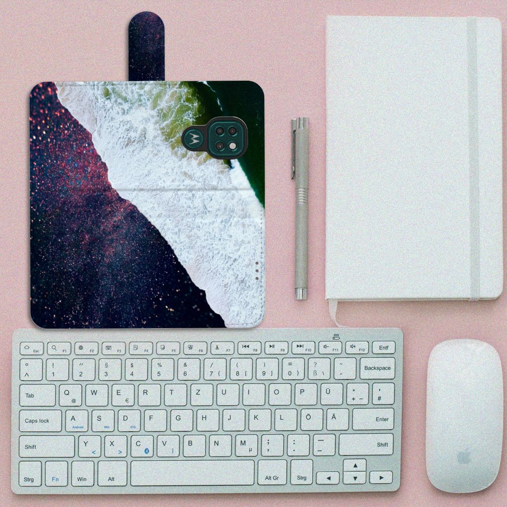 Een boekhoesje zoals deze heb je nog nooit gezien, het lijkt een beetje op een abstract kunstwerk wanneer je ernaar kijkt. Het is dan ook een compleet uniek design ontworpen door onze eigen designer. Onze designer noemt het ontwerp ‘Sea in Space’. Op de Motorola Moto G9 Play | E7 Plus Book Case zie je dan ook een combinatie van zee en een ruimte vol met sterren. Als jij houdt van zowel de zee als van science fiction dan is dit het ideale boekhoesje voor jou. Maar dit unieke hoesje heeft meer te bieden dan alleen design, je kunt er wel drie pasjes of twee pasjes en wat briefgeld in kwijt. Zo kun je jouw portemonnee lekker thuislaten als je naar de zee gaat of andere plekken van de wereld gaat ontdekken.