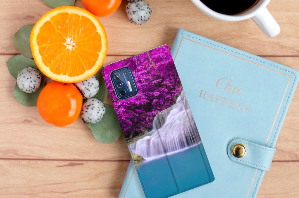 Van een waterval kun je een heel rustig gevoel krijgen, zeker als die op een Motorola Moto G9 Plus Book Cover staat dat jouw smartphone perfect beschermt tegen allerlei vormen van schade zoals krassen, barsten en scheuren. In de buurt van een waterval ben je tijdens warme zomerdagen niet alleen verzekerd van aangename verkoeling, het is ook een bijzonder rustgevende ervaring. Uit onderzoek blijkt zelfs dat watervallen een helend effect hebben op allerlei aandoeningen. Extra bijzonderheid aan de stand case vormen de paarse bossen op de achtergrond. Dit smartphonehoesje beschermt jouw telefoon aan alle zijden en beschikt over een opbergvakje voor pasjes en briefgeld. De case sluit perfect af dankzij de magneten van binnen. De houder aan de binnenzijde is van TPU. Alle zijden van het hoesje worden bedrukt. Een mooiere waterval met paarse achtergrond kom je op geen enkel ander hoesje tegen.