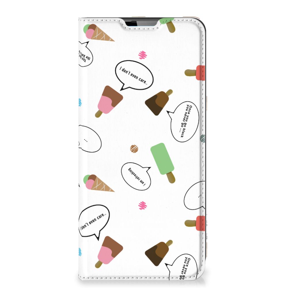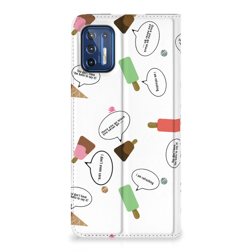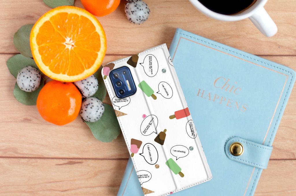 Van deze vrolijke Motorola Moto G9 Plus Flip Style Cover met daarop verschillende soorten ijsjes met tekstwolkjes krijg je sowieso een vrij en zomers gevoel. De zomer komt naar je toe met deze print van ijsjes met tekstwolkjes. Ben je op het strand, dan ontbreekt een lekker ijsje natuurlijk niet. Net zoals je je smartphone bij de hand hebt, met daaromheen een design hoesje met bijzondere ijsjes en tekstwolkjes. Jouw telefoon kan dan de bescherming in de vorm van een stand case met ijsjes zeer goed gebruiken. Alle zijden van dit hoesje worden bedrukt met ijsjes en dankzij de speciale standaard is het erg prettig om filmpjes te bekijken. De case wordt aan de binnenzijde met een magneet afgesloten en de houder aan de binnenzijde is van TPU. Onder alle weersomstandigheden zal deze case met 1 opbergvakje en ijsjes perfect functioneren, ook op het strand met een ijsje in je hand.