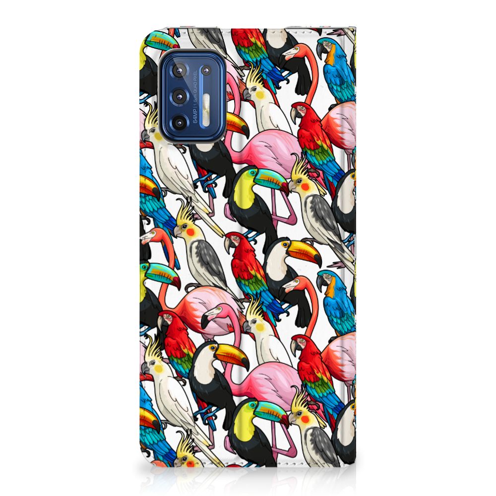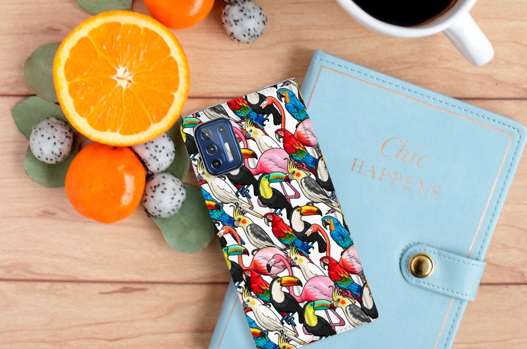 Dit exotische hoesje vol prachtige vogels is een genot voor het oog. Dankzij de felgekleurde toekans, papegaaien, flamingo’s en kaketoes op dit design word je meteen vrolijk als je naar dit hoesje kijkt. Je waant je meteen in de tropen met dit bonte gezelschap tegen een witte achtergrond. Het ontwerp staat op een Hoesje maken voor de Motorola Moto G9 Plus. Dit populaire smartphonehoesje met het beton-design heeft één vakje voor een pasje of briefgeld en is aan alle zijden bedrukt. Met de standcase zet je je telefoon gemakkelijk neer, zodat je je handen vrij hebt als je bijvoorbeeld een video wilt kijken. De binnenkant van de standcase is van grijs PU-leer. Dat is fijn, omdat je daardoor niet snel vlekken ziet op je hoesje.