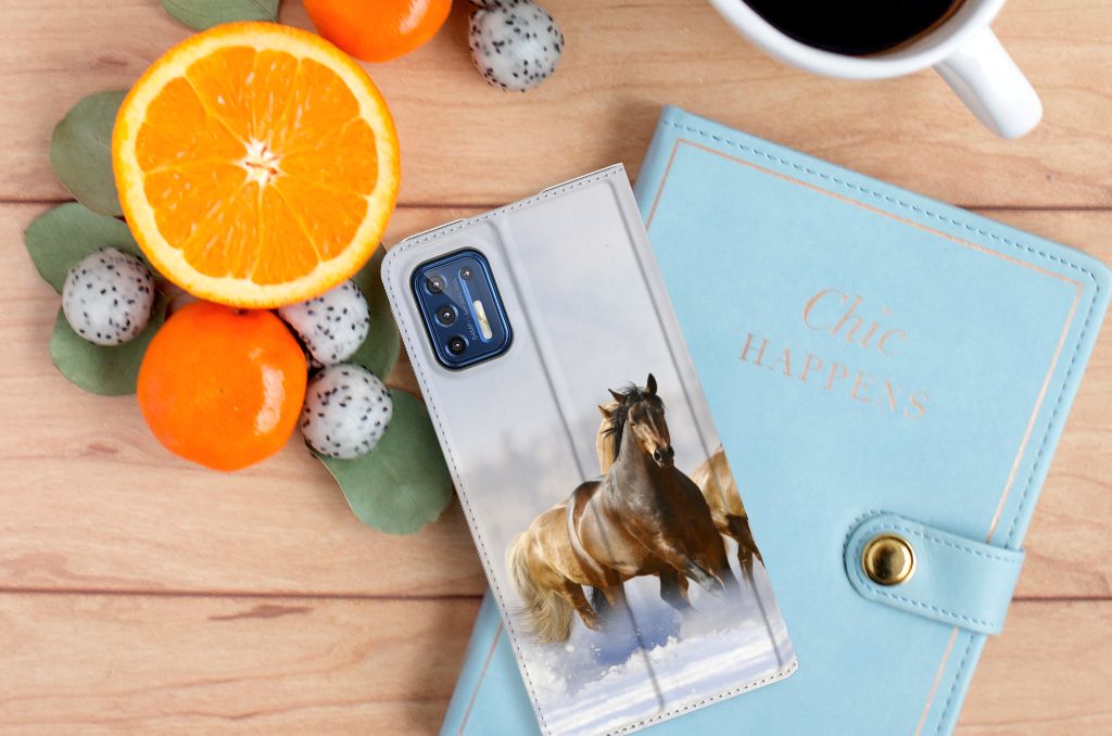 Voor de paardenliefhebbers onder ons hebben we onze collectie uitgebreid met dit design hoesje met print van paarden. Vroeger hield de mens vooral werkpaarden, inmiddels hebben we vriendschap gesloten met het paard. Vandaar dat het ook een favoriet dier is op onze smartphonehoesjes, zoals deze stand cases. Deze Motorola Moto G9 Plus Hoesje maken met Paarden is niet alleen super mooi en chique, het sluit ook nog perfect dankzij de magneet aan de binnenzijde. Verder heeft de case een TPU houder aan de binnenzijde en een houder voor een pasje. Zie je liever je eigen paard terug op een hoesje? Dat kan! Door zelf een uniek hoesje te ontwerpen, met eigen foto’s en teksten. De stand case met paarden wordt aan alle zijden bedrukt.