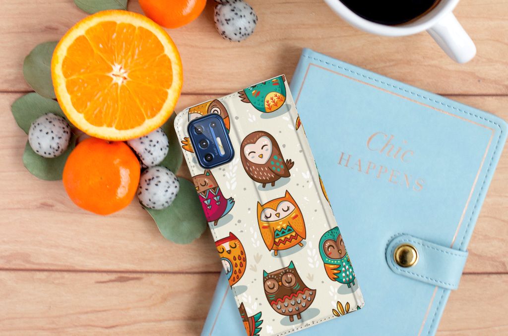 Deze Motorola Moto G9 Plus Hoesje maken met Vrolijke Uilen is echt iets voor de nachtbrakers onder ons. De uil is zoals je weet bij uitstek een vogel die in de nachtelijke uren actief is. Ben jij ook iemand die s ’nachts tot leven komt, dan is deze stand case met uilen in felle kleuren echt iets voor jou. Als je tot in de late uurtjes op stap bent, komt het goed uit dat jouw smartphone aan alle kanten goed is beschermd met deze stand case met uilen. De case met uilen heeft een magnetische sluiting aan de binnenkant, waardoor de hoes niet openklapt als die uit je handen valt. Jouw creditcard of pinpas heb je als het goed is veilig opgeborgen in het vakje aan de binnenzijde. De houder aan de binnenzijde van de case met print van uilen is van het flexibele TPU. De wat ruigere types hebben veel baat bij deze stand case met uilen in felle kleuren.