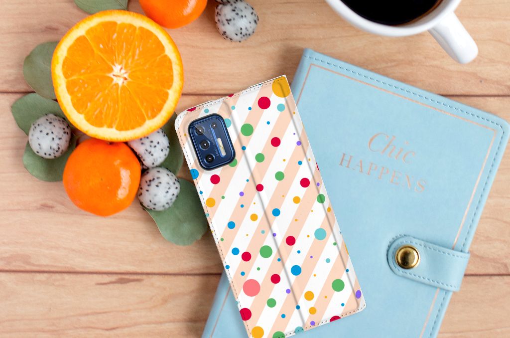Een Motorola Moto G9 Plus Hoesje met Magneet met verschillende kleuren stippen is een schitterende bescherming van jouw smartphone. De stand case met het design Dots in alle kleuren van de regenboog komt voor jou als geroepen. Maak je geen gebruik van dit zeer mooie hoesje, dan kan het met jouw smartphone een beetje beroerd aflopen. Dit mooie stand hoesje met verschillende kleuren stippen zorgt voor een volledige bescherming van je smartphone en wordt aan alle zijden bedrukt. Dankzij de speciale standaard kun je rustig achteroverleunend filmpjes bekijken terwijl je je handen vrij hebt. Verder is de houder aan de binnenzijde van TPU. Jouw telefoon is dus zeer goed opgeborgen en kan geen kant op. Met een hoesje met stippen in verschillende kleuren op alle zijden blijft jouw telefoon volledig in tact. Heb je liever een stand case met stippen in andere opvallende kleuren? Ontwerp dan zelf case met je eigen foto’s en teksten!