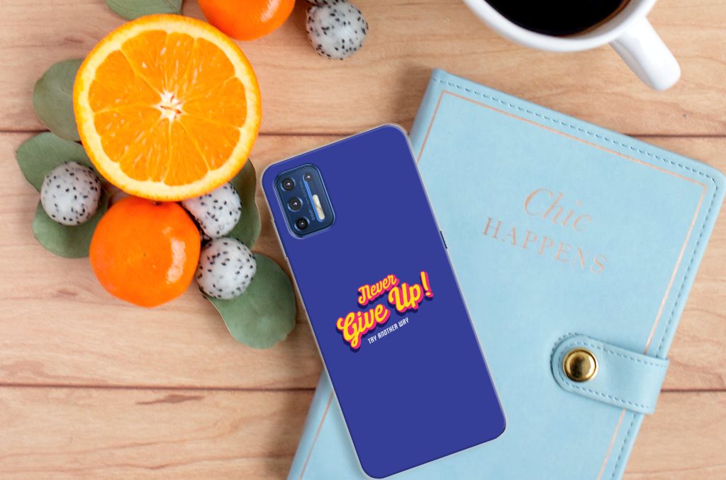 Ben je op zoek naar een uniek telefoonhoesje voor je Motorola Moto G9 Plus? Dan ben je bij B2C Telecom aan het juiste adres! Speciaal voor jou hebben we dit prachtige Never Give Up design in onze collectie hoesjes opgenomen. Het design wordt bedrukt op een Siliconen hoesje met naam en is gemaakt van flexibel rubber. Het design wordt alleen aan de bovenkant van het hoesje bedrukt en de randen blijven transparant. Aan de zijkanten zijn uitsparingen gemaakt waardoor je met gemak alle knoppen en poorten kunt bedienen. Wij adviseren om dit hoesje in combinatie met een screenprotector te gebruiken voor een langere levensduur van je telefoon. Wil je dit design hoesje nog iets extra's geven? Voeg dan gratis je naam of een quote toe! Is dit design hoesje toch niet helemaal wat je zocht? Ontwerp dan zelf een hoesje in ons ontwerpprogramma.