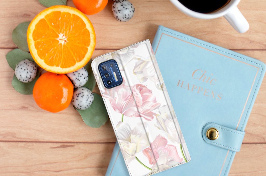Een bosje bloemen doet een mens (en zijn smartphone) goed. De witte en roze bloemen op dit Motorola Moto G9 Plus Smart Cover geven jouw smartphone een zeer mooie uitstraling. Je wordt er ook meteen een stuk rustiger van als je aan het appen of aan het bellen bent. Valt dan je telefoon op de grond, dan zal er dankzij de stand case met het design Lovely Flowers ontstaan. Onze stand cases met roze en witte bloemen zien er zeer prettig uit en zijn heel praktisch, wat blijkt uit onder meer het vakje aan de binnenkant en de handige standaard waarmee je de smartphone rechtop op tafel neer kunt zetten. De roze en witte bloemen passen goed op alle zijden van de case. Op deze stand case van leer en TPU (houder aan de binnenkant) kun je trouwens ook je eigen bloemige ontwerp zetten. In een paar simpele stappen maak je zelf een stand hoesje met daarop jouw mooiste bloemen.