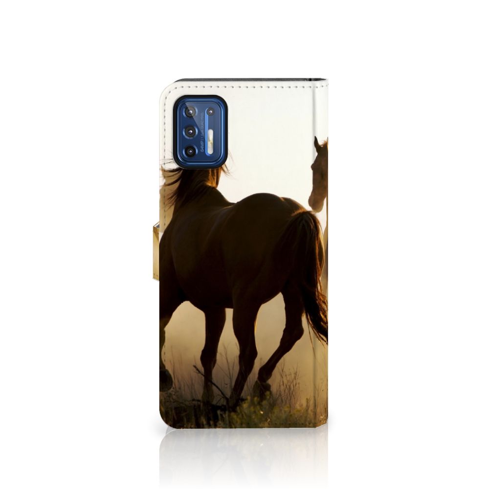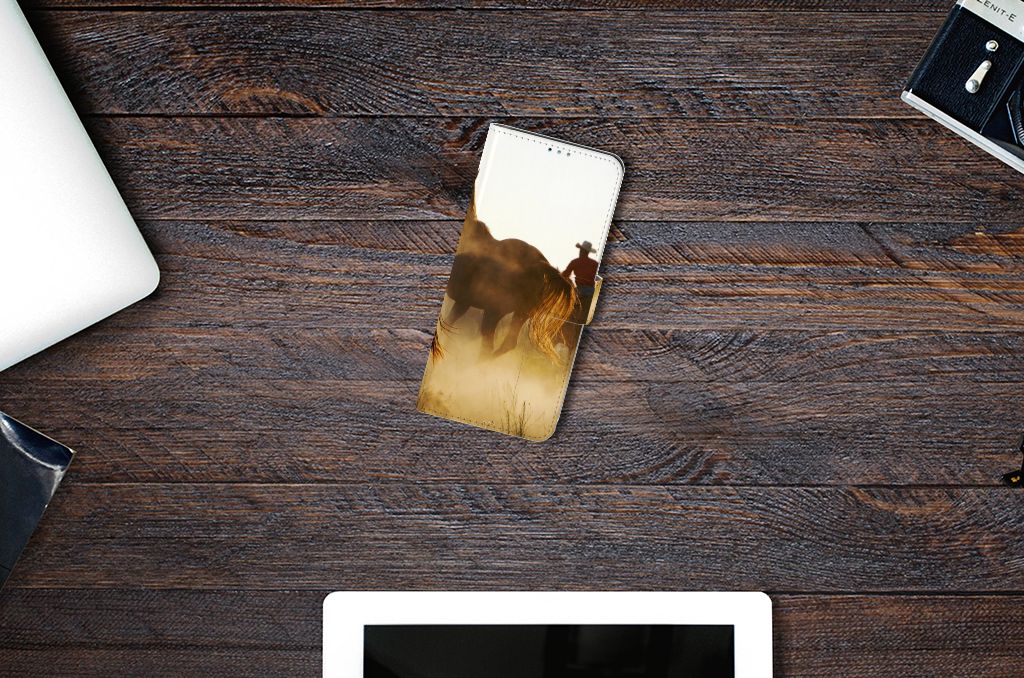 Voor de paardenliefhebbers onder ons hebben we onze collectie uitgebreid met dit design hoesje met print van een cowboy met paarden. Vroeger hield de mens vooral werkpaarden, inmiddels hebben we vriendschap gesloten met het paard. Vandaar dat het ook een favoriet dier is op onze smartphonehoesjes, zoals deze boekhoesjes. Dit Telefoonhoesje met Pasjes met paarden is niet alleen super mooi en chique, het sluit ook nog perfect dankzij het lipje aan de buitenzijde. Verder heeft de case een TPU houder aan de binnenzijde en houders voor pasjes en briefgeld. Zie je liever je eigen paard terug op een hoesje voor jouw Motorola Moto G9 Plus? Dat kan! Door zelf een uniek hoesje te ontwerpen, met eigen foto’s en teksten. Het boekhoesje met paarden wordt aan alle zijden bedrukt.