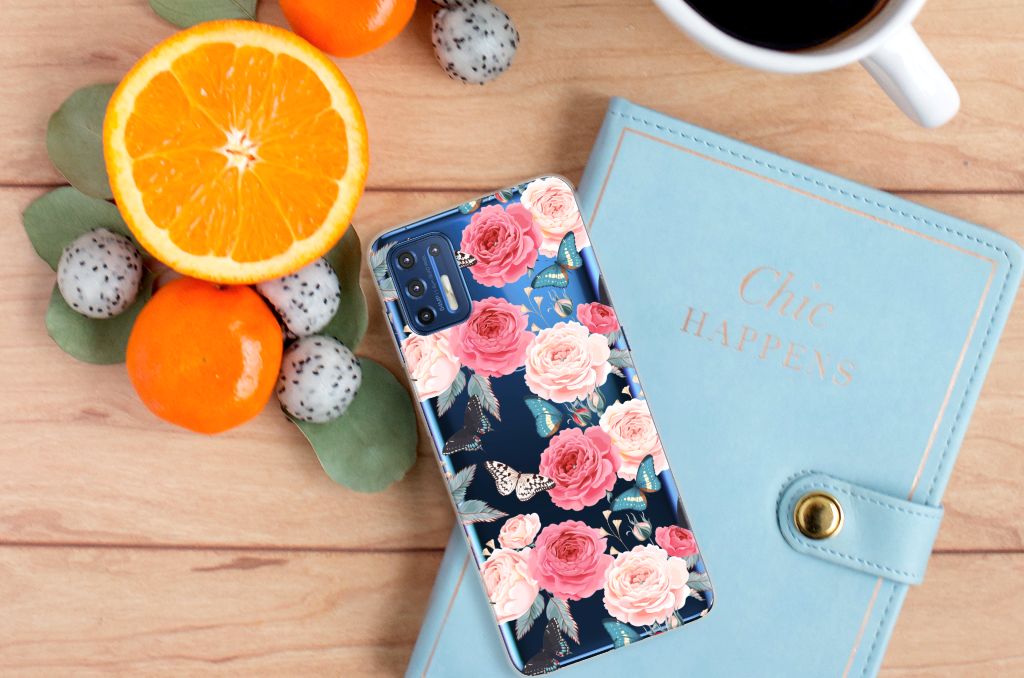 Ben je op zoek naar een uniek telefoonhoesje voor je Motorola Moto G9 Plus? Dan ben je bij B2C Telecom aan het juiste adres! Speciaal voor jou hebben we dit prachtige Butterfly Roses design in onze collectie hoesjes opgenomen. Het design wordt bedrukt op een TPU Case en is gemaakt van flexibel rubber. Het design wordt alleen aan de bovenkant van het hoesje bedrukt en de randen blijven transparant. Aan de zijkanten zijn uitsparingen gemaakt waardoor je met gemak alle knoppen en poorten kunt bedienen. Wij adviseren om dit hoesje in combinatie met een screenprotector te gebruiken voor een langere levensduur van je telefoon. Wil je dit design hoesje nog iets extra's geven? Voeg dan gratis je naam of een quote toe! Is dit design hoesje toch niet helemaal wat je zocht? Ontwerp dan zelf een hoesje in ons ontwerpprogramma.