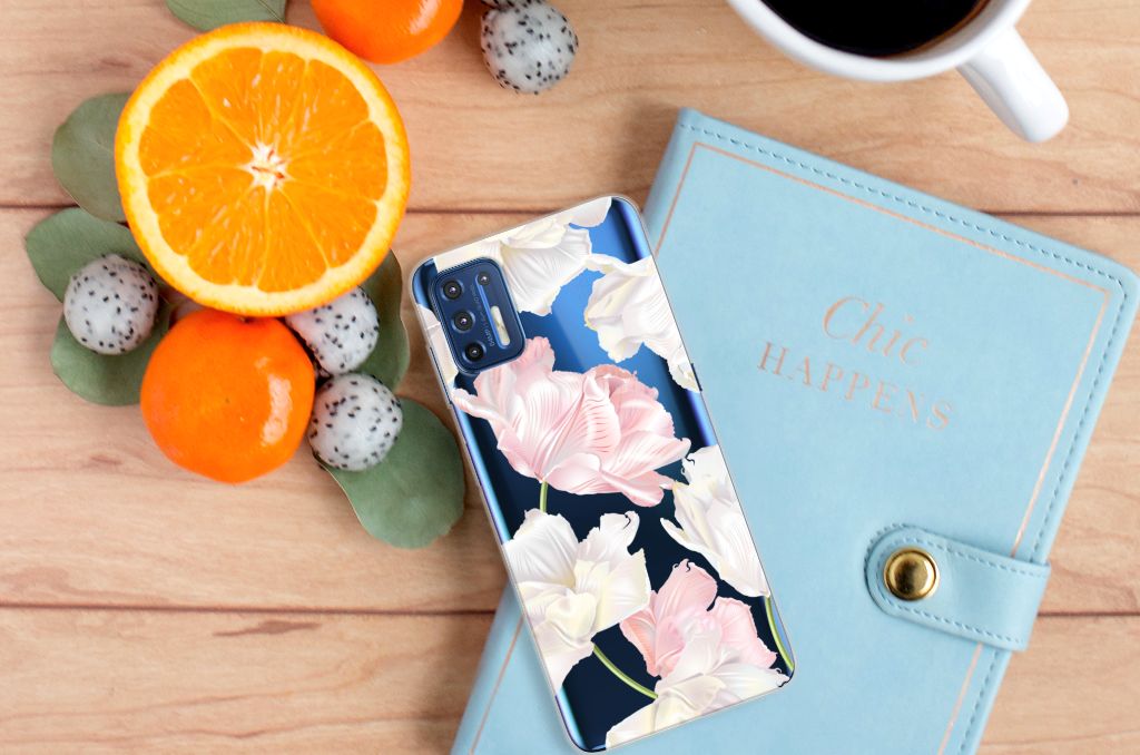 Een bosje bloemen doet een mens (en zijn smartphone) goed. De witte en roze bloemen op deze Motorola Moto G9 Plus TPU Case geven jouw smartphone een zeer mooie uitstraling. Je wordt er ook meteen een stuk rustiger van als je aan het appen of aan het bellen bent. Valt dan je telefoon op de grond, dan zal er dankzij de tpu case met het design Lovely Flowers ontstaan. Helemaal niet als je er een screenprotector bij hebt gekocht. Onze tpu cases met roze en witte bloemen zien er zeer prettig uit en zijn heel praktisch, getuige onder meer de opstaande randen en het flexibele materiaal. Alleen de achterkant van de tpu case wordt bedrukt met roze en witte bloemen. Op deze tpu case kun je trouwens ook een eigen ontwerp zetten. In een paar simpele stappen ontwerp je zelf een stand case met daarop jouw favoriete bloemen.