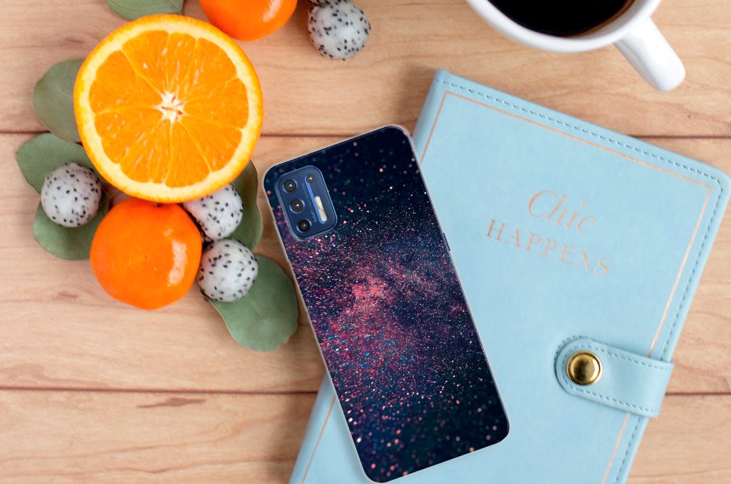Je waant je in de zevende hemel met dit kunstzinnige, glitterachtige design hoesje met paarse en blauwe kleuren tegen een inktzwarte achtergrond. Het smartphone hoesje heeft ook een wat science fiction achtige allure. Met deze design Stars case zul je zeker opvallen. Als dit je bedoeling is, bestel dat snel dit waanzinnig mooie product voor je Motorola Moto G9 Plus. Het telefoonhoesje is van alle gemakken voorzien en combineert een hele fraaie uitstraling met maximaal comfort. Bovendien is het gemaakt van zeer stevig en flexibel materiaal. Het unieke design, door B2C Telecom ontworpen, staat op een TPU Hoesje. Dit hoesje wordt alleen aan de bovenkant bedrukt en is zeer flexibel. De randen van het hoesje blijven transparant en worden niet bedrukt. Met dit hoesje past jouw telefoon altijd in je broekzak.