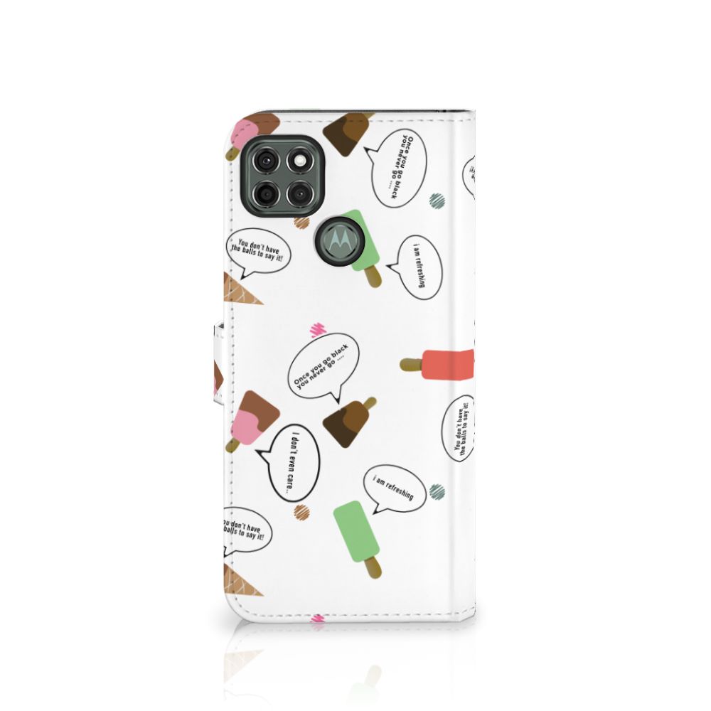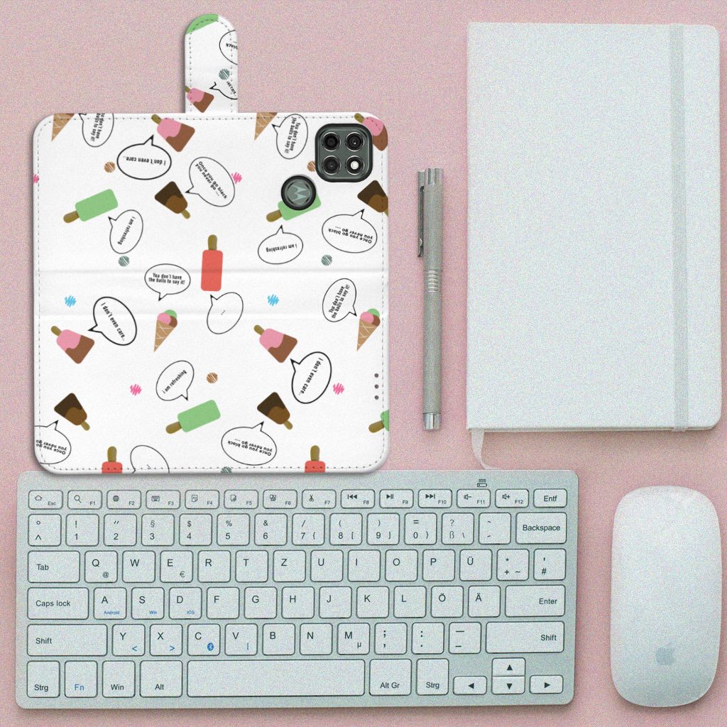 Van dit vrolijke Motorola Moto G9 Power Book Cover met daarop verschillende soorten ijsjes met tekstwolkjes krijg je sowieso een vrij en zomers gevoel. De zomer komt naar je toe met deze print van ijsjes met tekstwolkjes. Ben je op het strand, dan ontbreekt een lekker ijsje natuurlijk niet. Net zoals je je smartphone bij de hand hebt, met daaromheen een design hoesje met bijzondere ijsjes en tekstwolkjes. Jouw telefoon kan dan de bescherming in de vorm van een boekhoesje met ijsjes zeer goed gebruiken. Alle zijden van dit hoesje worden bedrukt met ijsjes en tekstwolkjes. De case heeft een lipje aan de buitenzijde voor het afsluiten van de telefoon en de houder aan de binnenzijde is van TPU. Onder alle weersomstandigheden zal deze case met verschillende opbergvakjes perfect functioneren, ook op het strand met een ijsje in je hand.