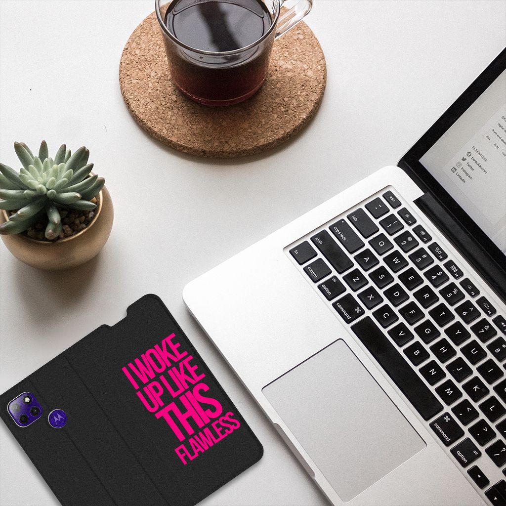 Met deze zwarte Motorola Moto G9 Power Hoesje met tekst met deze paarse tekst kun je met recht trots zijn. De case komt als geroepen voor jouw smartphone. Met dit zwarte design hoesje met Woke Up tekst heb je een zeer solide product in handen. Dit zeer populaire smartphone hoesje heeft 1 vakje en is aan alle zijden bedrukt. Verder heeft de case een standaard en een magneet aan de binnenkant. De houder is van TPU, de buitenzijde van PU-leer. We willen je er ook op wijzen dat je zelf een hoesje kunt ontwerpen, met eigen beelden en teksten. Met onze Phone Case Designer kun je zelfs opvallende effecten, patronen en clip arts aan het ontwerp toevoegen.
