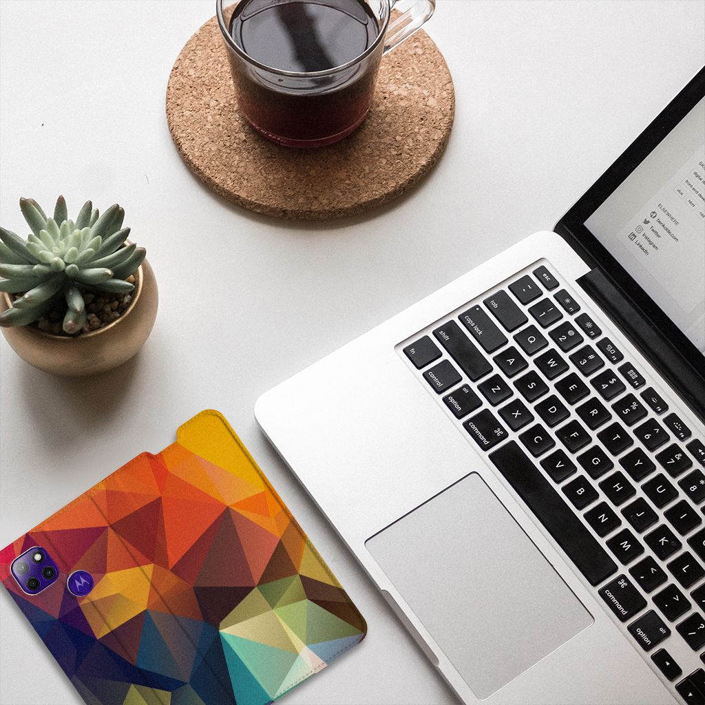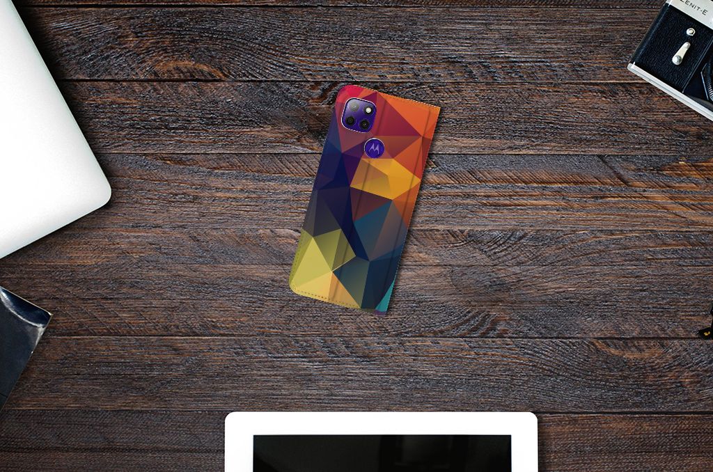 Veelkleurige driehoeken die samen eindeloze asymmetrische patronen lijken te vormen. Het is het abstracte schouwspel dat op dit fraaie hoesje voor je Motorola Moto G9 Power direct de aandacht trekt noemen we voor het gemak trekt noemen we voor het gemak Polygon Color. De een ziet er een berglandschap in, de ander piramides. Wat zie jij erin? Zeker is in elk geval dat de aanblik van dit fascinerende ontwerp je niet snel gaat vervelen. Het kleurige spel van lijnen en vlakken blijft eindeloos boeien en geeft jouw Stand Case een hippe en kunstzinnige uitstraling. De kracht die het lijnenspel uitstraalt, komt ook terug in het hoesje zelf. De solide hoes van PU-leer beschikt ook over een 1 pashouder en een speciale standaard. Het hoesje wordt afgesloten met een magneet aan de binnenzijde. De houder aan de binnenzijde is van TPU. Alle zijden worden bedrukt.