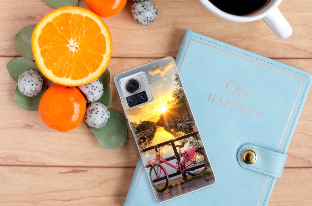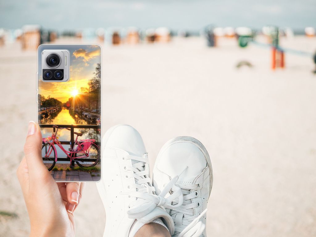 Amsterdam is meer dan ooit een toeristische trekpleister. Een bezoek aan de hoofdstad is niet compleet als je niet aanlegt bij de Amsterdamse Grachten. Ze zijn een symbool van de stad en hebben een enorme culturele en historische waarde. Daarom kunnen ze natuurlijk niet ontbreken in onze collectie design hoesjes. Dit schitterende design hoesje met Amsterdamse grachten tref je enkel en alleen aan bij B2C Telecom. De ondergaande zon en de fleurige en fraaie bloempakketten zorgen voor een prachtig totaalplaatje. Amsterdam is wereldberoemd om haar prachtige grachten uit de zeventiende eeuw. Dit smartphone hoesje is hier een eerbetoon aan. Het design staat op een TPU case. Dit Motorola Moto X30 Pro Siliconen Back Cover wordt alleen aan de bovenkant bedrukt en is zeer flexibel. De randen van het hoesje blijven transparant.