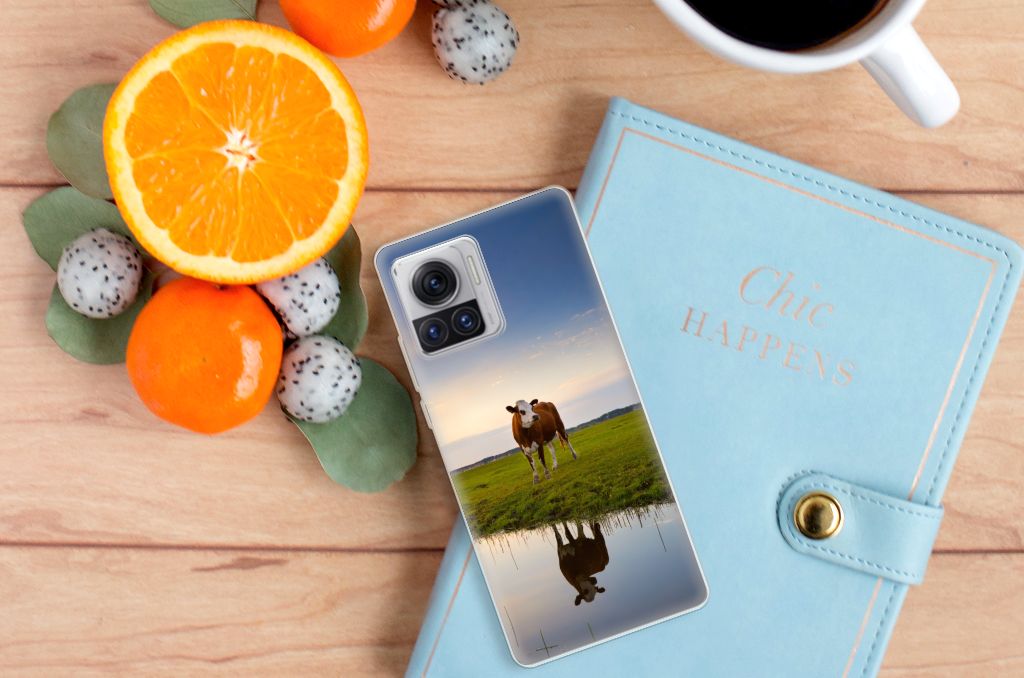 Het levert een idyllisch plaatje op, dit hoesje met een koe en ondergaande zon op de achtergrond. Door een koe buiten te laten lopen en grazen, hebben ze minder kans om ziek te worden. De Koe graast het liefst met soortgenoten, al zijn deze een stukje van de koe op de case verwijderd. Dit levert ook een mooi plaatje op, zoals je kunt zien op dit design hoesje. Dit tpu hoesje met koeien ziet er flexibel uit en is voorzien van alle uitsparingen. Een Motorola Moto X30 Pro TPU Hoesje met koeien beschermt jouw smartphone vooral aan de achterkant en zijkanten. De zijkanten blijven transparant, de rest van het hoesje is bedrukt. Koeien herkauwen het liefst liggend, behalve wanneer het regent. Zo goed als grazen voelt voor koeien, zo duurzaam zal jouw smartphone blijven met dit design hoesje. Het TPU is schokabsorberend en niet te breken. De TPU case past altijd in je broekzak.