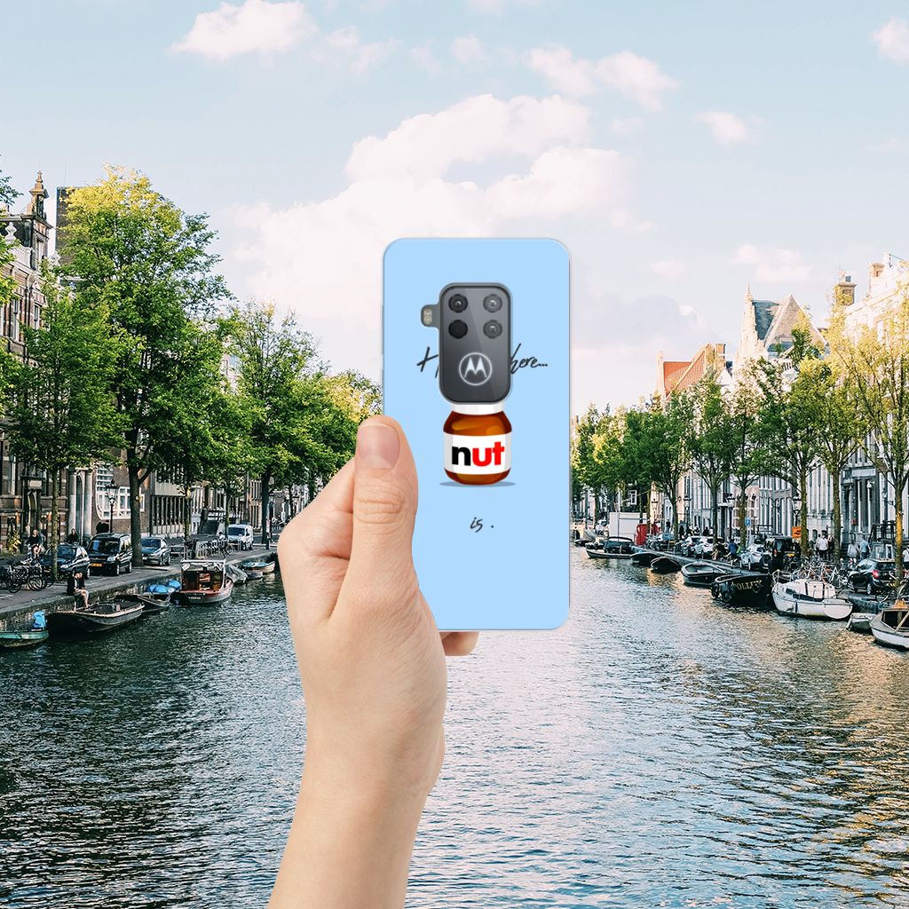 Ben je liefhebber van chocoladepasta, dan is dit het perfecte Motorola One Zoom Siliconen Case voor jou. De chocoladepasta is enorm populair, dus is het niet zo heel gek dat je een ‘Nut Home’ tpu case in een blauwe kleur aantreft in ons assortiment design hoesjes met illustraties. Dit tpu hoesje is zeer flexibel en past altijd in je broekzak. Alleen de bovenkant van dit hoesje wordt door ons bedrukt in blauwe kleur met de pasta, op zeer duurzame manier. Mensen die houden van de bekendste pasta van het moment, kiezen voor deze blauwe tpu case. Er staan geen illustraties op de zijkanten van een tpu case. Je kunt ook een eigen tekst toevoegen aan het opvallende design.