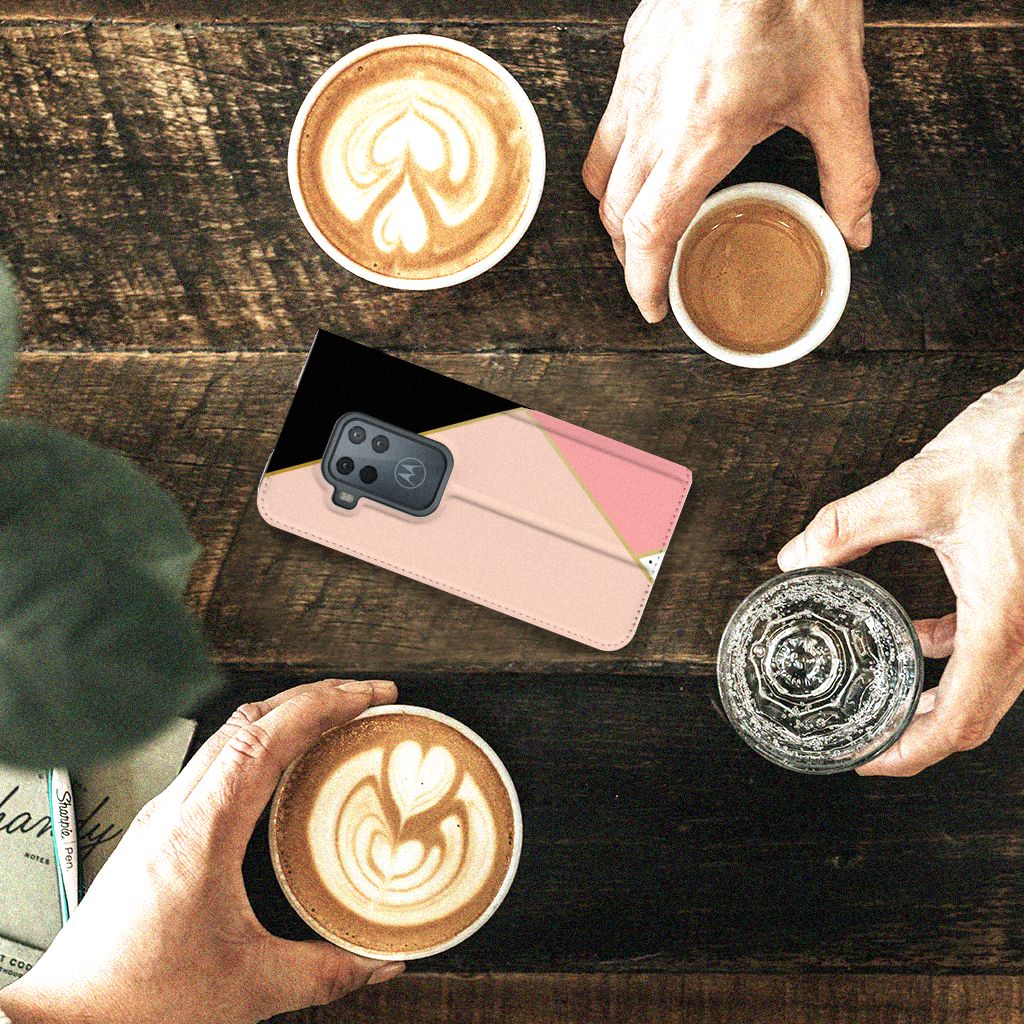 Motorola One Zoom Print Stand Case Zwart Roze Vormen