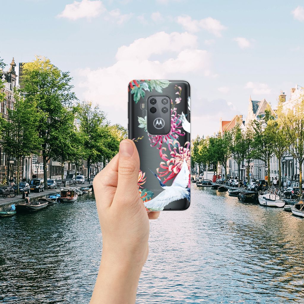 Verspreid over de hele wereld leven 19 soorten ooievaars. De spanwijdte – dat is de afstand van vleugeltip tot vleugeltip – van een volwassen ooievaar kan 2.50 meter bedragen. De gebieden waarin de ooievaar broedt, liggen in heel Europa, het Midden-Oosten, West- en Centraal-Azië en Noordwest-Afrika. Het ideale leefgebied van de ooievaar is een half open tot open landschap met veel afwisseling in grondgebruik en begroeiing. De begroeiing op dit design hoesje, in allerlei verschillende kleuren, zal niet alleen voor de ooievaars fraai zijn. Jij zult er zelf ook heel vrolijk van worden. Het in het oog springende design staat op een TPU Hoesje. Dit telefoonhoesje wordt alleen aan de bovenkant bedrukt en is zeer flexibel. De randen van het hoesje blijven transparant en worden niet bedrukt. Met dit hoesje past jouw Motorola One Zoom altijd in je broekzak.