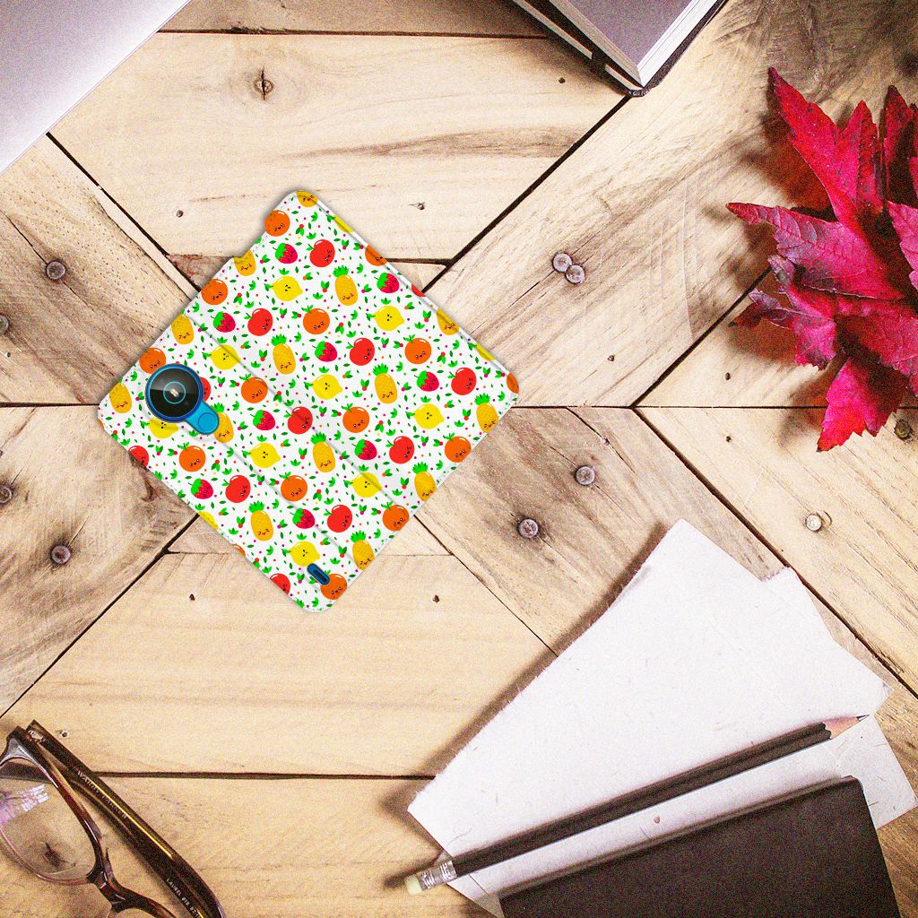 Een fris, fruitig en vrolijk hoesje, deze case met afbeeldingen van aardbeien, ananassen, appels, sinaasappels en citroenen. Minstens twee stuks fruit per dag wordt aanbevolen als dagelijkse hoeveelheid voor de mens. Dit verkleint de kans op allerlei ziekten. Dus met het aantal stukken fruit op de Nokia 1.4 Flip Style Cover zou je wel een maandje zoet moeten zijn. Met het hoesje zelf kun je je hele leven doen, dit is namelijk niet stuk te krijgen. Dit komt door het sterke en flexibele materiaal waarvan het gemaakt is. De vrolijk stemmende case het desing Fruits maakt jouw telefoon dus zeer duurzaam. Zorg ervoor dat jouw smartphone gezond blijft en kies voor dit hoesje met frivool fruit. Een stand case met fruit beschermt jouw telefoon aan alle kanten en beschikt over een 1 opbergvakje en een speciale standaard. Het hoesje met fruit wordt afgesloten met een magneet aan de binnenzijde. De houder aan de binnenzijde is van TPU.