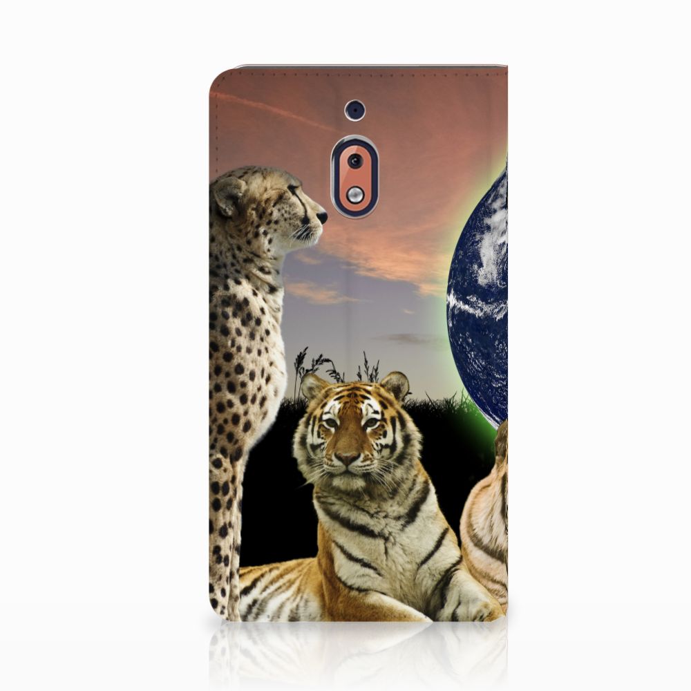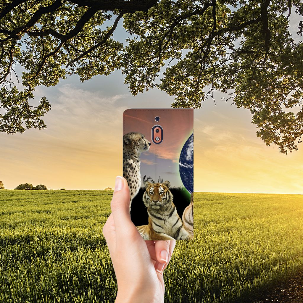 Deze standcase met roofdieren kan exclusief in het bezit van jou komen. Bovendien kun je hier zelf nog unieke teksten en/of beelden aan toevoegen. Je Hoesje maken krijgt dan een unieke identiteit. Roofdieren zoals tijgers op dit hoesje zijn voortdurend op zoek naar een geschikte prooi. De tijgers met aardbol op de achtergrond op deze stand case geven jouw Nokia 2.1 2018 een hele stoere uitstraling. Deze bijzondere case is van PU-leer (buitenzijde) en TPU (binnenzijde) en beschikt over een houder en een speciale standaard. Verder is deze stand case met roofdieren voorzien van een magnetische sluiting aan de binnenzijde. Je zorgt voor de perfecte bescherming van je smartphone met dit design hoesje met roofdieren met aardbol op de achtergrond.