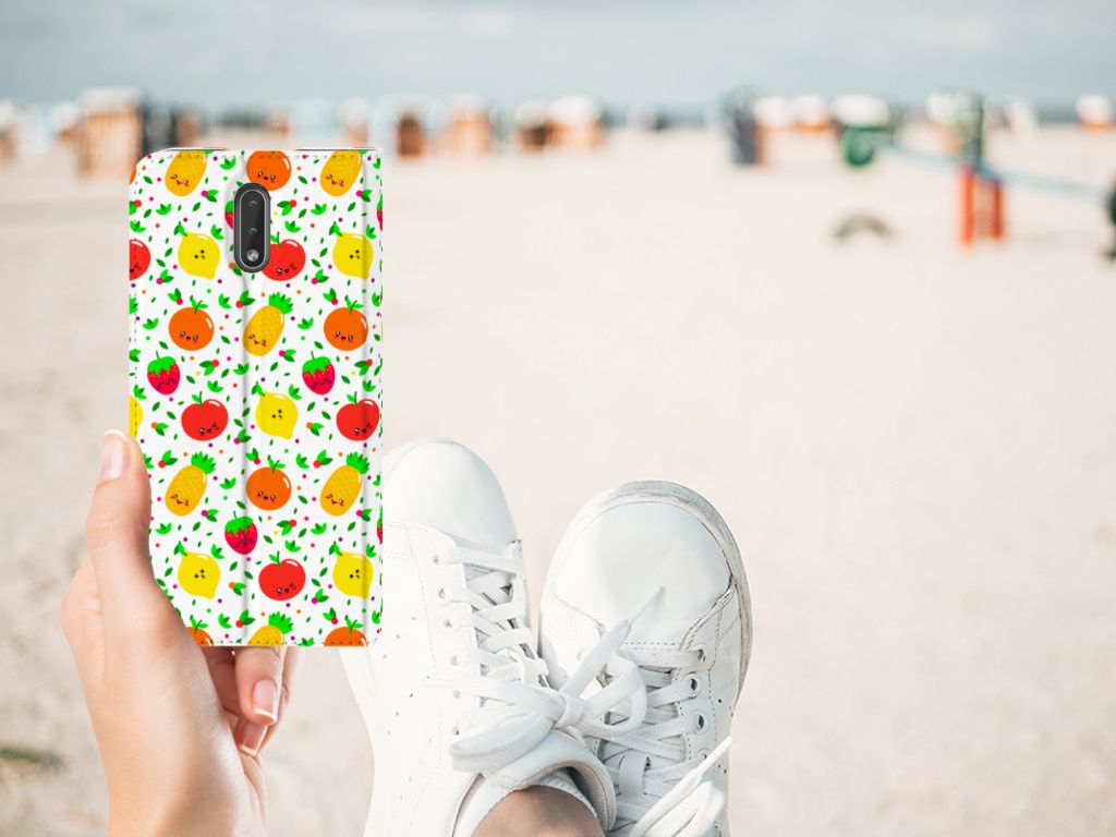 Een fris, fruitig en vrolijk hoesje, deze case met afbeeldingen van aardbeien, ananassen, appels, sinaasappels en citroenen. Minstens twee stuks fruit per dag wordt aanbevolen als dagelijkse hoeveelheid voor de mens. Dit verkleint de kans op allerlei ziekten. Dus met het aantal stukken fruit op de Nokia 2.3 Flip Style Cover zou je wel een maandje zoet moeten zijn. Met het hoesje zelf kun je je hele leven doen, dit is namelijk niet stuk te krijgen. Dit komt door het sterke en flexibele materiaal waarvan het gemaakt is. De vrolijk stemmende case het desing Fruits maakt jouw telefoon dus zeer duurzaam. Zorg ervoor dat jouw smartphone gezond blijft en kies voor dit hoesje met frivool fruit. Een stand case met fruit beschermt jouw telefoon aan alle kanten en beschikt over een 1 opbergvakje en een speciale standaard. Het hoesje met fruit wordt afgesloten met een magneet aan de binnenzijde. De houder aan de binnenzijde is van TPU.