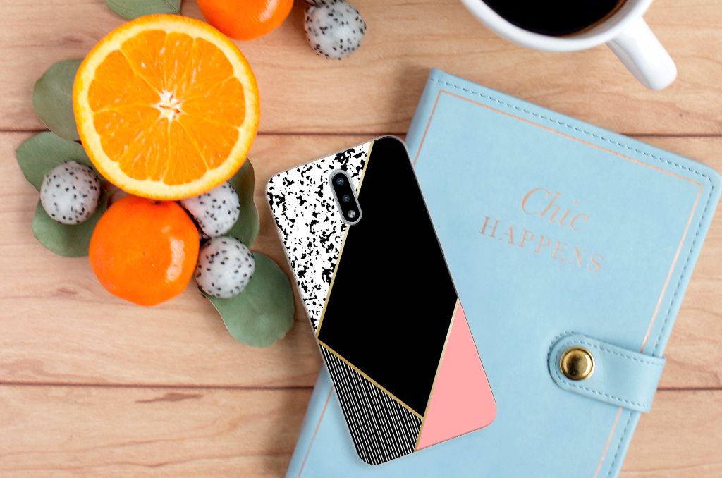 - Met een tpu-siliconen hoesje met roze, zwarte en witte vlakken blijft jouw telefoon in tact.