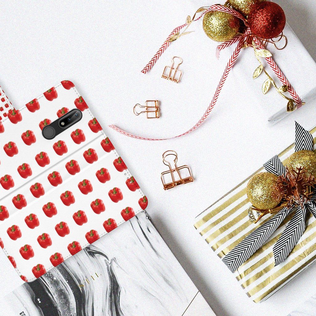Er zit pit in jouw Nokia 2.4 Book Cover dankzij dit design met rode paprika’s. Paprika’s zijn er in allerlei kleuren en vormen en ze hebben gemeen dat ze heel erg gezond zijn. De rode paprika’s op deze case staan op een grijs met witte geblokte achtergrond en vormen een opvallende verschijning. Heb jij ooit iemand in je nabije omgeving rond zien lopen met een design hoesje met rode paprika’s? Waarschijnlijk niet. Dit boekhoesje met rode paprika’s beschermt jouw telefoon aan alle zijden en beschikt over verschillende opbergvakjes voor pasjes en briefgeld. De case sluit perfect af met het magnetische lipje aan de buitenkant. Zeker weten dat je met dit hoesje met rode paprika’s een smartphone accessoire te pakken hebt waarmee je jezelf in de schijnwerpers zet. De houder aan de binnenzijde van het boekhoesje met rode paprika’s is van TPU. Als je andere kleuren paprika’s op je hoesje wilt, raden we je aan ons assortiment design hoesjes te bekijken of zelf een hoesje te ontwerpen.