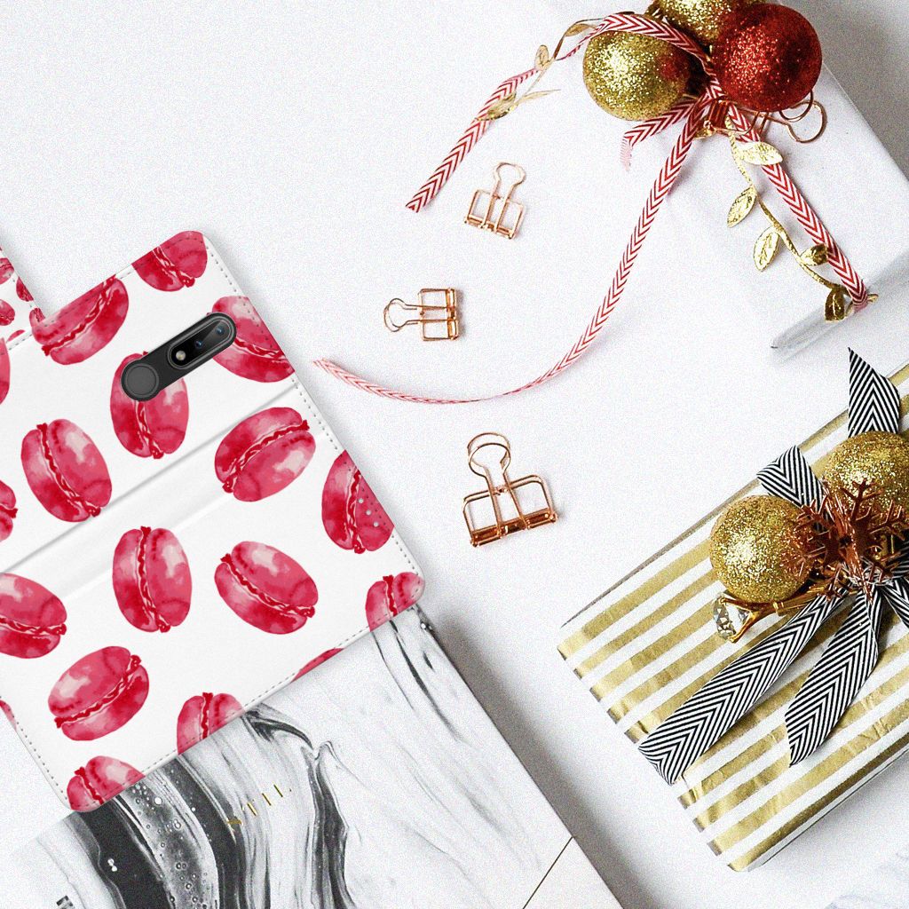 Dit hoesje met Pink Macarons is een zeer opvallende bescherming voor jouw smartphone. Macarons zijn Franse koekjes: kleine, rond en luchtig. Ze worden in veel verschillende smaken gemaakt, herkenbaar aan de verschillende kleuren zoals chocolade (donkerbruin), mokka (middenbruin), kersen (rood), pistache (groen), aardbei (roze), framboos (karmijn). Deze kleuren kun je niet allemaal zien op dit fraaie design hoesje met roze macarons. Heb je altijd al een Nokia 2.4 Book Cover willen hebben met roze macarons? Grijp dan nu je kans. Een boekhoesje heeft zeer veel goede eigenschappen, zoals opbergvakjes aan de binnenkant en een magnetische sluiting in de vorm van een lipje aan de buitenzijde. Dit design hoesje met roze macarons wordt aan alle zijden bedrukt, zelfs het lipje krijgt een afbeelding van een roze macaron. De houder aan de binnenkant van het hoesje is van TPU.