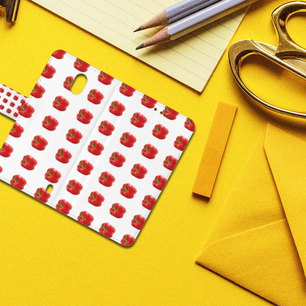 Er zit pit in jouw Nokia 2 Book Cover dankzij dit design met rode paprika’s. Paprika’s zijn er in allerlei kleuren en vormen en ze hebben gemeen dat ze heel erg gezond zijn. De rode paprika’s op deze case staan op een grijs met witte geblokte achtergrond en vormen een opvallende verschijning. Heb jij ooit iemand in je nabije omgeving rond zien lopen met een design hoesje met rode paprika’s? Waarschijnlijk niet. Dit boekhoesje met rode paprika’s beschermt jouw telefoon aan alle zijden en beschikt over verschillende opbergvakjes voor pasjes en briefgeld. De case sluit perfect af met het magnetische lipje aan de buitenkant. Zeker weten dat je met dit hoesje met rode paprika’s een smartphone accessoire te pakken hebt waarmee je jezelf in de schijnwerpers zet. De houder aan de binnenzijde van het boekhoesje met rode paprika’s is van TPU. Als je andere kleuren paprika’s op je hoesje wilt, raden we je aan ons assortiment design hoesjes te bekijken of zelf een hoesje te ontwerpen.