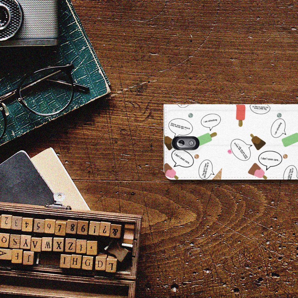 Van deze vrolijke Nokia 3.1 (2018) Flip Style Cover met daarop verschillende soorten ijsjes met tekstwolkjes krijg je sowieso een vrij en zomers gevoel. De zomer komt naar je toe met deze print van ijsjes met tekstwolkjes. Ben je op het strand, dan ontbreekt een lekker ijsje natuurlijk niet. Net zoals je je smartphone bij de hand hebt, met daaromheen een design hoesje met bijzondere ijsjes en tekstwolkjes. Jouw telefoon kan dan de bescherming in de vorm van een stand case met ijsjes zeer goed gebruiken. Alle zijden van dit hoesje worden bedrukt met ijsjes en dankzij de speciale standaard is het erg prettig om filmpjes te bekijken. De case wordt aan de binnenzijde met een magneet afgesloten en de houder aan de binnenzijde is van TPU. Onder alle weersomstandigheden zal deze case met 1 opbergvakje en ijsjes perfect functioneren, ook op het strand met een ijsje in je hand.