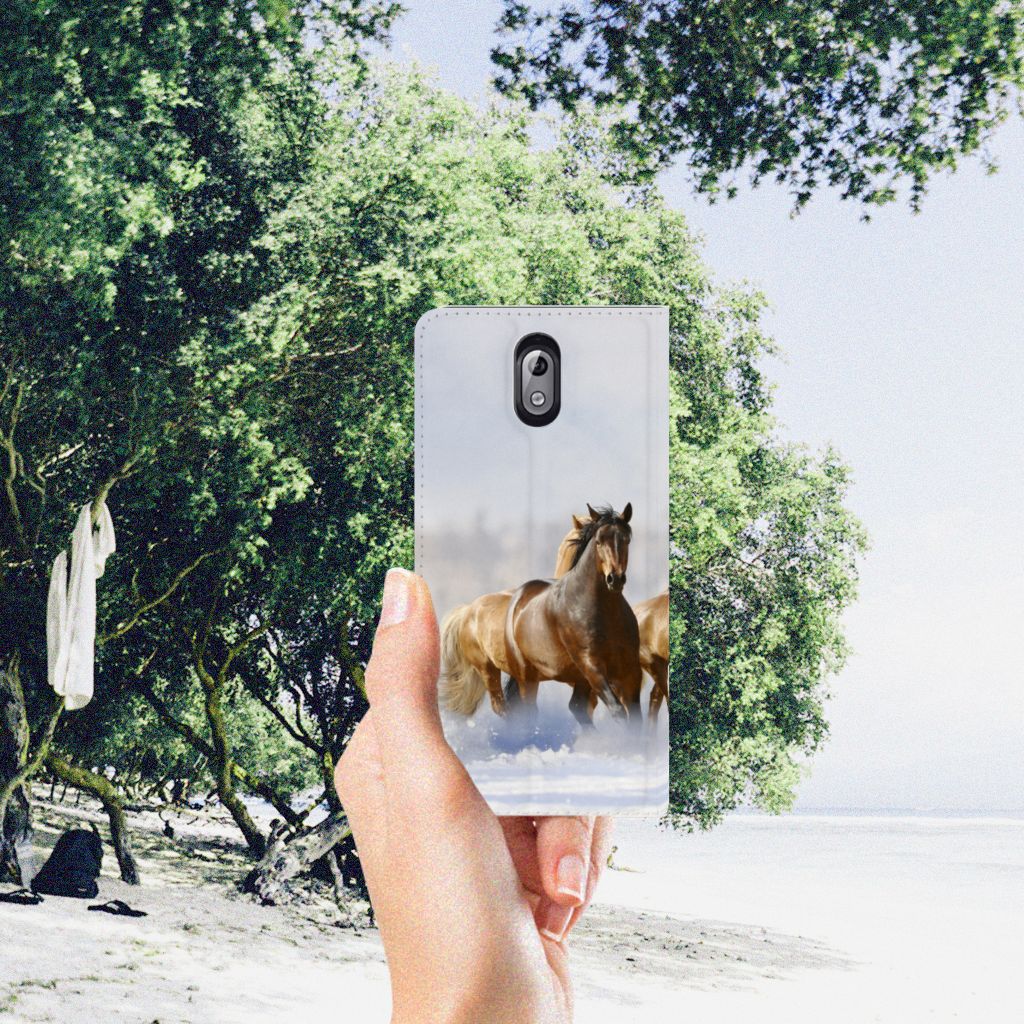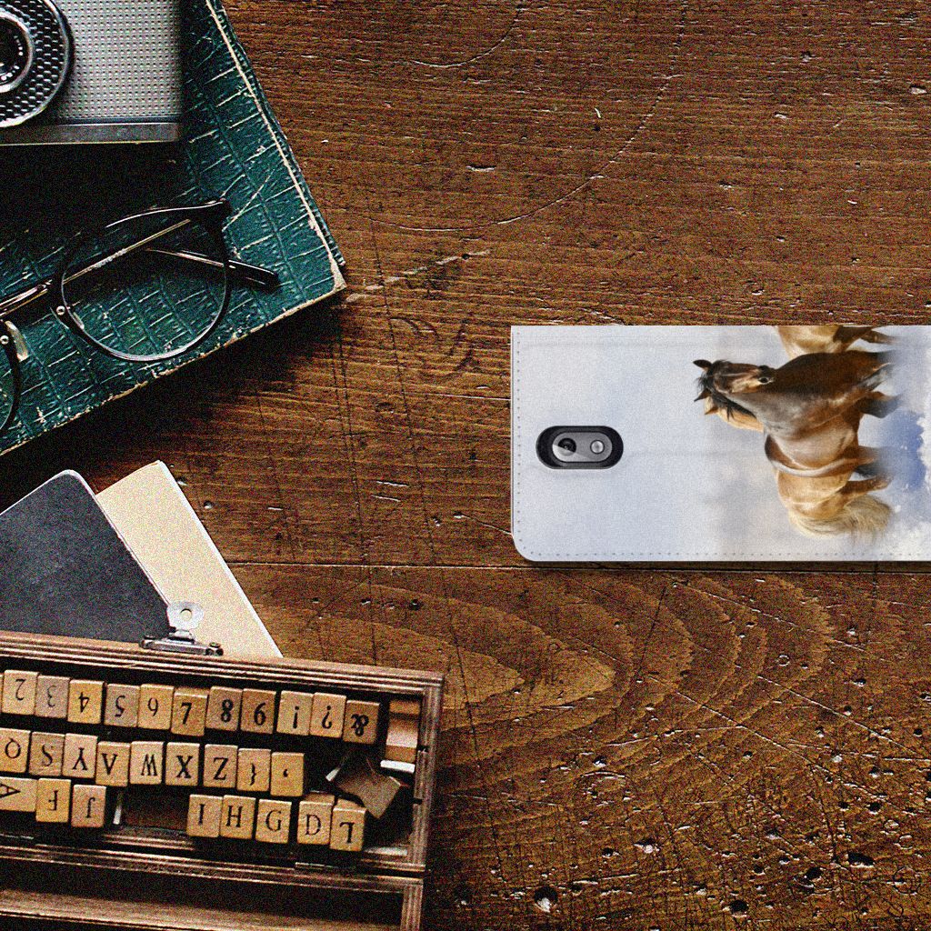 Voor de paardenliefhebbers onder ons hebben we onze collectie uitgebreid met dit design hoesje met print van paarden. Vroeger hield de mens vooral werkpaarden, inmiddels hebben we vriendschap gesloten met het paard. Vandaar dat het ook een favoriet dier is op onze smartphonehoesjes, zoals deze stand cases. Deze Nokia 3.1 (2018) Hoesje maken met Paarden is niet alleen super mooi en chique, het sluit ook nog perfect dankzij de magneet aan de binnenzijde. Verder heeft de case een TPU houder aan de binnenzijde en een houder voor een pasje. Zie je liever je eigen paard terug op een hoesje? Dat kan! Door zelf een uniek hoesje te ontwerpen, met eigen foto’s en teksten. De stand case met paarden wordt aan alle zijden bedrukt.