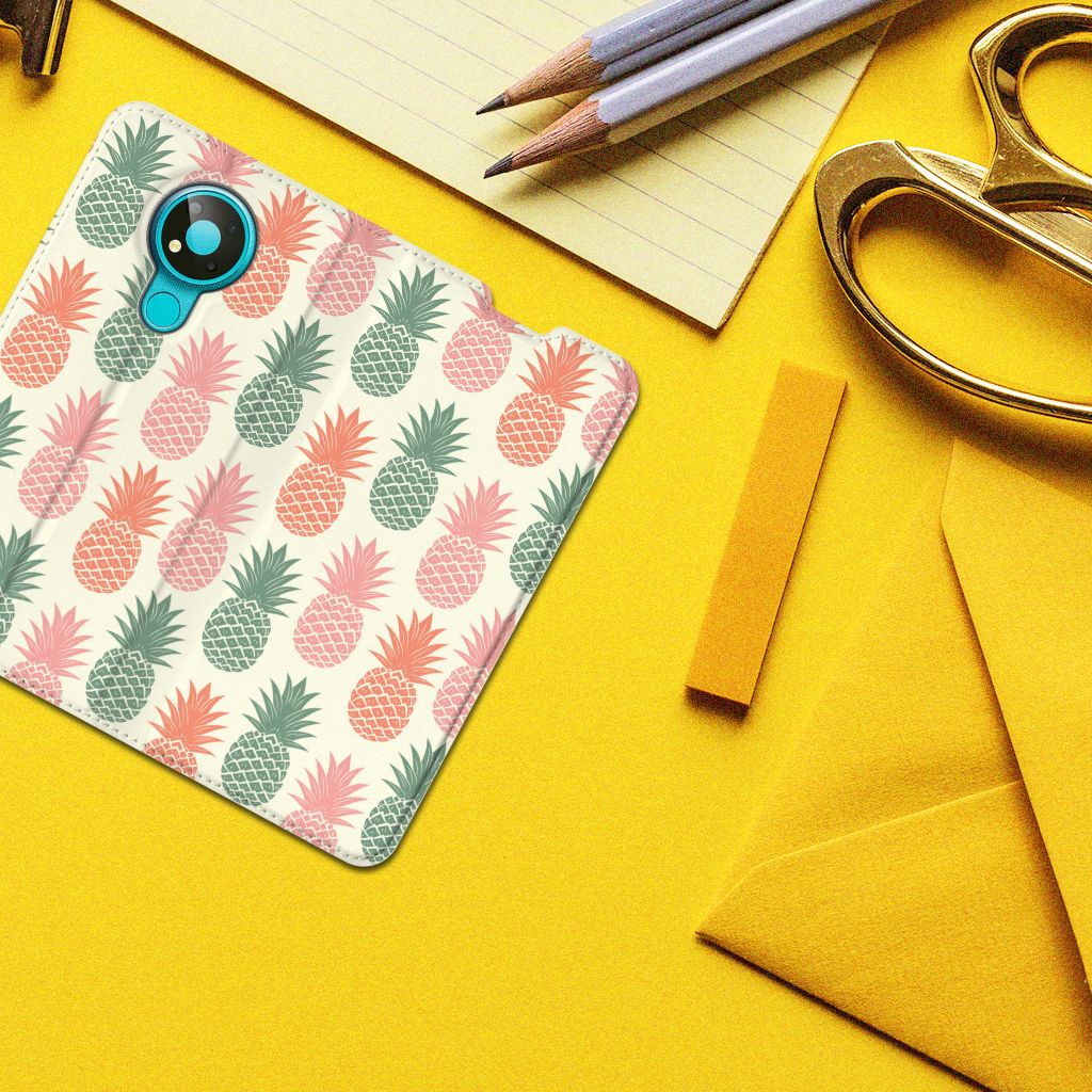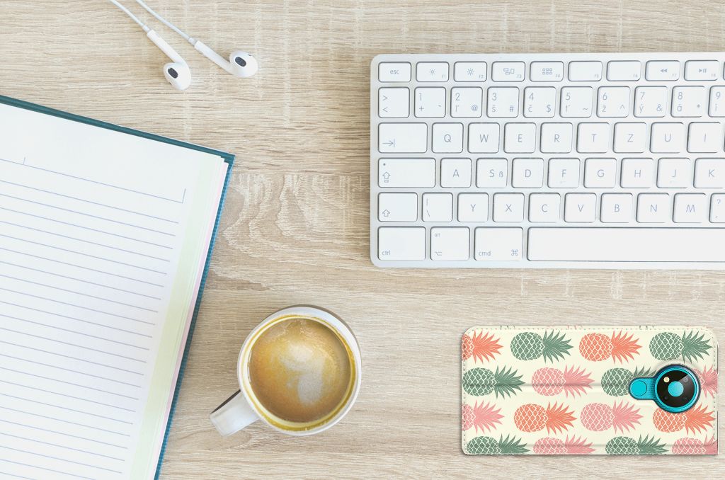 Ananas is een woord uit het Tupi, de taal van de Tupi-indianen, en betekent uitmuntende vrucht. Dit fruit van zeer hoge kwaliteit staat op onze superieure boekhoesjes, stand cases, hard cases en TPU cases. Jij blijft er gezond uitzien als je zo nu en dan een hap neemt van een Ananas , jouw smartphone blijft tip top in orde als je er een leuk telefoonhoesje omheen doet. Een ananas heeft stevig, veerkrachtig vruchtvlees. Een beetje te vergelijken met het TPU in onze hoesjes. TPU is elastisch materiaal, dat zeer buigzaam is. Vandaar dat het zeer schokbestendig is. Het ananas design staat op een stand case. Deze Nokia 3.4 Flip Style Cover beschermt jouw telefoon aan alle kanten en beschikt over een 1 opbergvakje en een speciale standaard. Het hoesje wordt afgesloten met een magneet aan de binnenzijde. De houder aan de binnenzijde is van TPU.