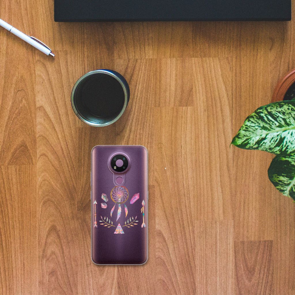Een dromenvanger werd lang geleden al door een indianenvolk in Noord-Amerika gebruikt om nare dromen te weren. Nu nog hangen mensen over de hele wereld dromenvangers boven hun bed. Maar ook op een telefoonhoesje staat zo’n boho dreamcatcher heel mooi. Dit mooie design dat bestaat uit een tipi, pijlen en dromenvanger heeft veel verschillende prachtige kleuren. Maar omdat het ontwerp minimalistisch en klein is, is het design toch subtiel te noemen. Dit ontwerp staat op een Telefoonhoesje met Naam voor je Nokia 3.4. TPU is flexibel en heel erg sterk. Zo is je telefoon aan de achterkant en de randen heel goed beschermd. De case is aan de bovenkant bedrukt, de randen blijven transparant. Het TPU-hoesje is perfect te combineren met een screenprotector, zo zijn je telefoon en je beeldscherm altijd goed beschermd.