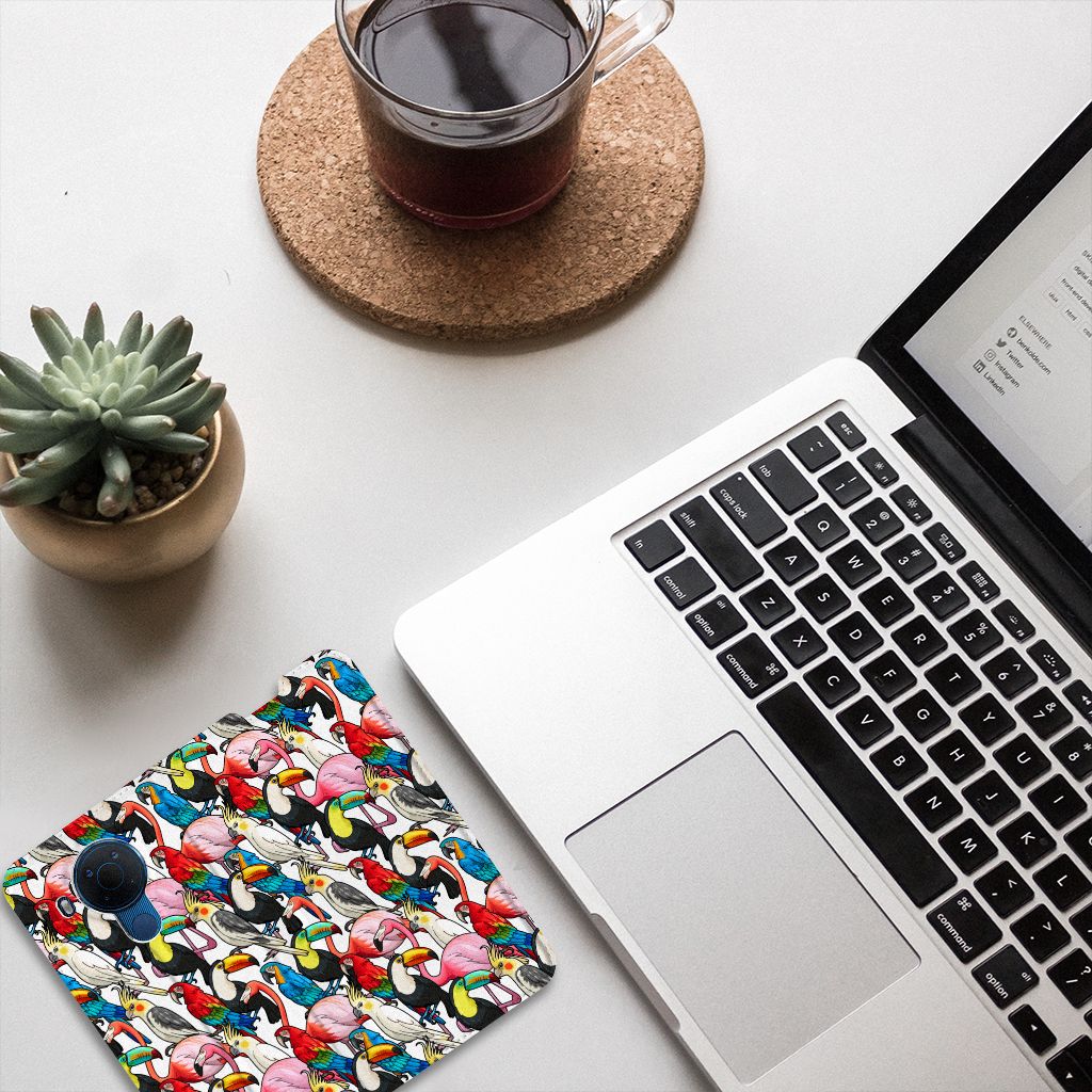 Dit exotische hoesje vol prachtige vogels is een genot voor het oog. Dankzij de felgekleurde toekans, papegaaien, flamingo’s en kaketoes op dit design word je meteen vrolijk als je naar dit hoesje kijkt. Je waant je meteen in de tropen met dit bonte gezelschap tegen een witte achtergrond. Het ontwerp staat op een Hoesje maken voor de Nokia 5.4. Dit populaire smartphonehoesje met het beton-design heeft één vakje voor een pasje of briefgeld en is aan alle zijden bedrukt. Met de standcase zet je je telefoon gemakkelijk neer, zodat je je handen vrij hebt als je bijvoorbeeld een video wilt kijken. De binnenkant van de standcase is van grijs PU-leer. Dat is fijn, omdat je daardoor niet snel vlekken ziet op je hoesje.