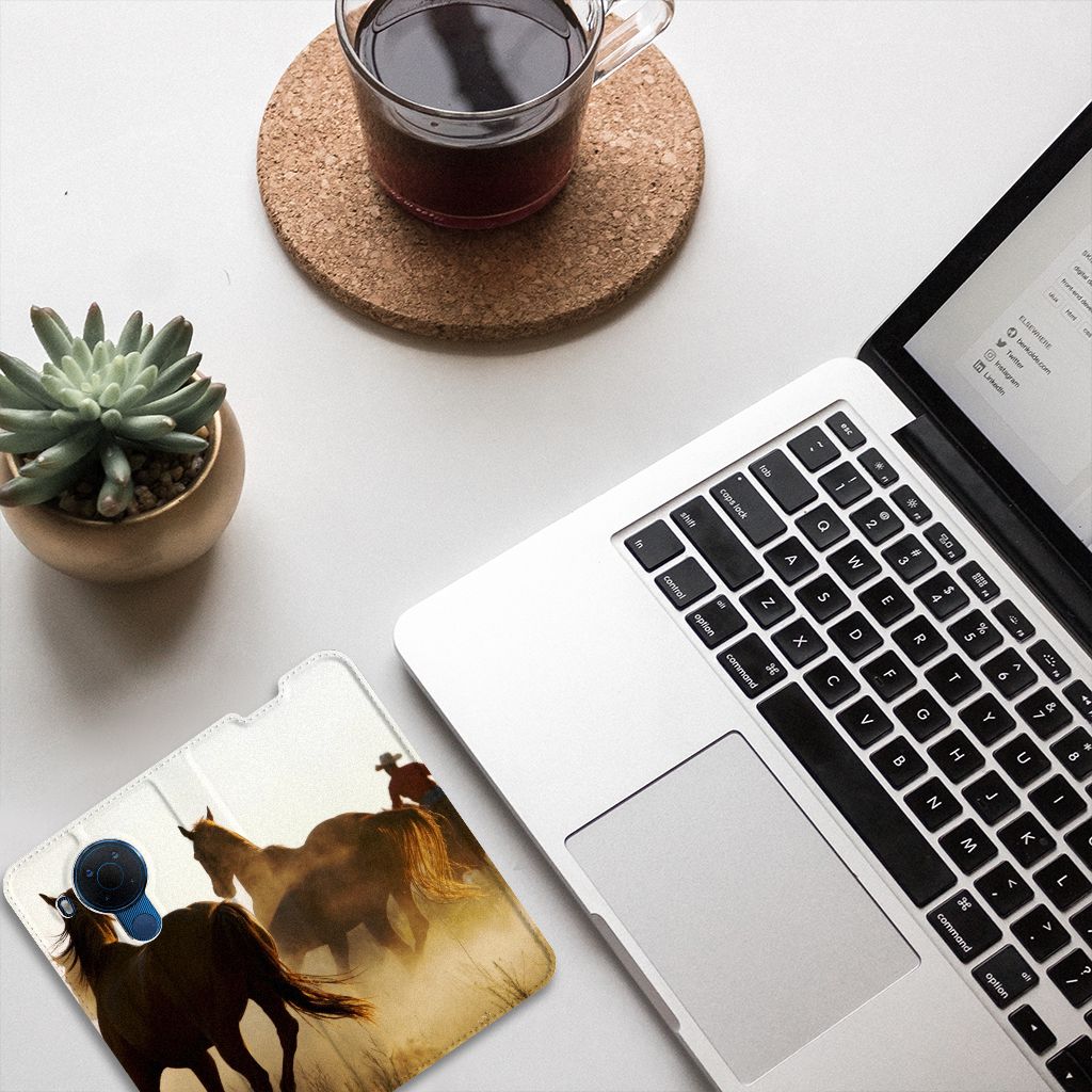 Voor de paardenliefhebbers onder ons hebben we onze collectie uitgebreid met dit design hoesje met print van paarden. Vroeger hield de mens vooral werkpaarden, inmiddels hebben we vriendschap gesloten met het paard. Vandaar dat het ook een favoriet dier is op onze smartphonehoesjes, zoals deze stand cases. Deze Nokia 5.4 Hoesje maken met paarden is niet alleen super mooi en chique, het sluit ook nog perfect dankzij de magneet aan de binnenzijde. Verder heeft de case een TPU houder aan de binnenzijde en een houder voor een pasje. Zie je liever je eigen paard terug op een hoesje? Dat kan! Door zelf een uniek hoesje te ontwerpen, met eigen foto’s en teksten. De stand case met paarden wordt aan alle zijden bedrukt.