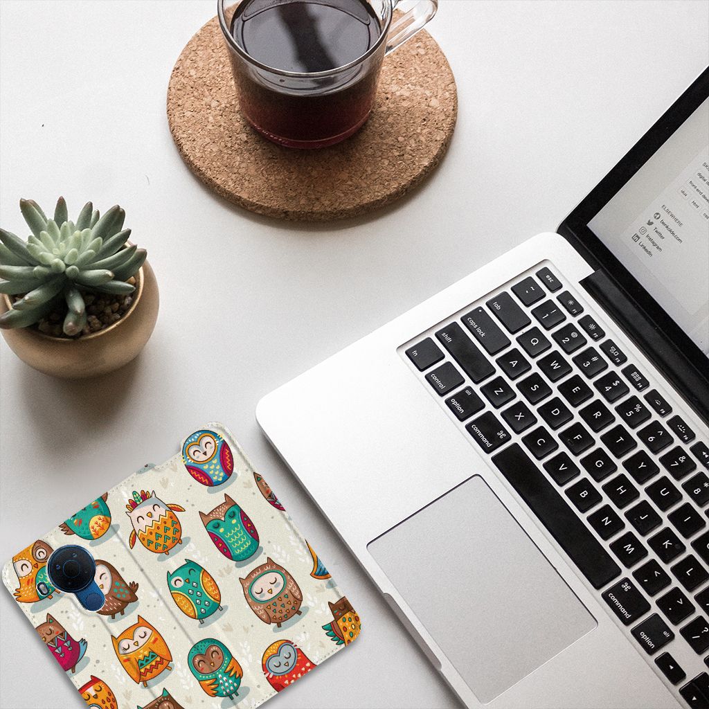 Deze Nokia 5.4 Hoesje maken met Vrolijke Uilen is echt iets voor de nachtbrakers onder ons. De uil is zoals je weet bij uitstek een vogel die in de nachtelijke uren actief is. Ben jij ook iemand die s ’nachts tot leven komt, dan is deze stand case met uilen in felle kleuren echt iets voor jou. Als je tot in de late uurtjes op stap bent, komt het goed uit dat jouw smartphone aan alle kanten goed is beschermd met deze stand case met uilen. De case met uilen heeft een magnetische sluiting aan de binnenkant, waardoor de hoes niet openklapt als die uit je handen valt. Jouw creditcard of pinpas heb je als het goed is veilig opgeborgen in het vakje aan de binnenzijde. De houder aan de binnenzijde van de case met print van uilen is van het flexibele TPU. De wat ruigere types hebben veel baat bij deze stand case met uilen in felle kleuren.
