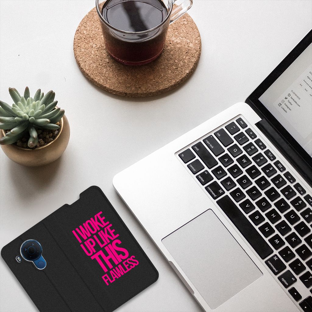 Met deze zwarte Nokia 5.4 Hoesje met tekst met deze paarse tekst kun je met recht trots zijn. De case komt als geroepen voor jouw smartphone. Met dit zwarte design hoesje met Woke Up tekst heb je een zeer solide product in handen. Dit zeer populaire smartphone hoesje heeft 1 vakje en is aan alle zijden bedrukt. Verder heeft de case een standaard en een magneet aan de binnenkant. De houder is van TPU, de buitenzijde van PU-leer. We willen je er ook op wijzen dat je zelf een hoesje kunt ontwerpen, met eigen beelden en teksten. Met onze Phone Case Designer kun je zelfs opvallende effecten, patronen en clip arts aan het ontwerp toevoegen.