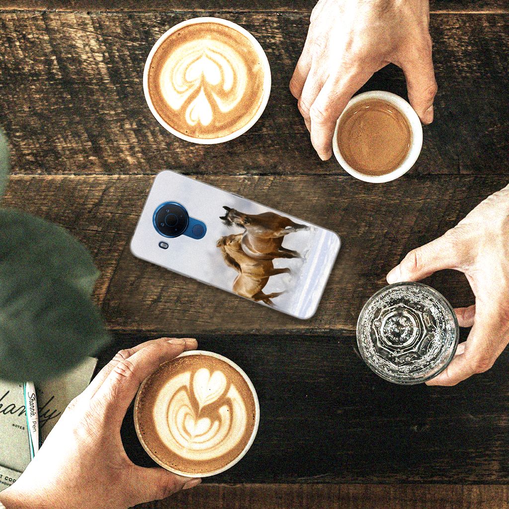 Voor de paardenliefhebbers onder ons hebben we onze collectie uitgebreid met dit design hoesje met print van paarden. Vroeger hield de mens vooral werkpaarden, inmiddels hebben we vriendschap gesloten met het paard. Vandaar dat het ook een favoriet dier is op onze smartphonehoesjes, zoals deze tpu case. Een TPU Hoesje voor de Nokia 5.4 met Paarden is niet alleen super mooi en chique, maar ook nog eens zeer flexibel. Verder is de case schokabsorberend en heeft het opstaande randen. Zie je liever je eigen paard terug op een hoesje. Dat kan! Door zelf een uniek hoesje te ontwerpen, met eigen foto’s en teksten. De TPU case wordt aan de bovenzijde bedrukt, de zijkanten blijven transparant.